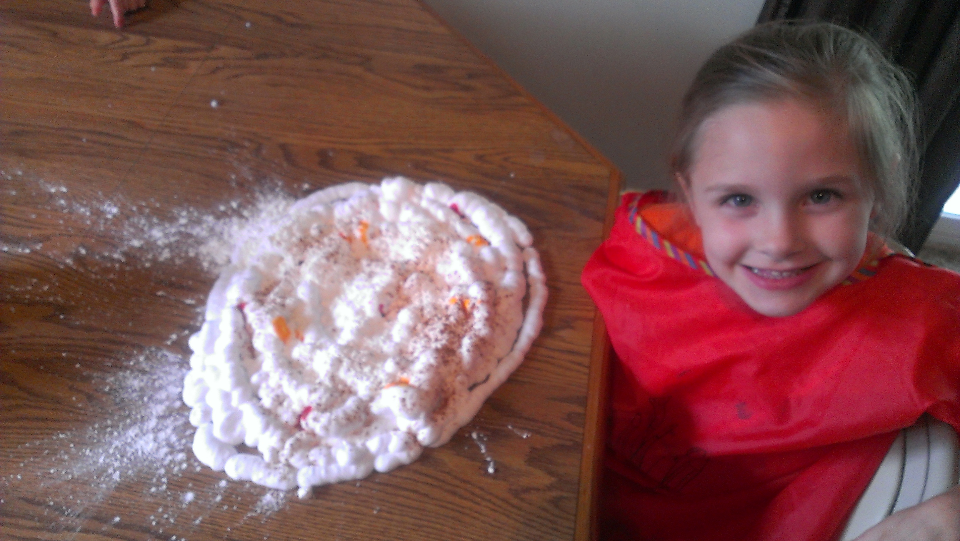 I love how you can see Lightning McQueen’s eyes in that last pic! Noah wanted to drive his car through the mess and I thought, hey it will wash off 🙂 why not?! He loved it! Eventually the corn starch made the shaving cream become a lot like Oobleck that we made last year! The substance was hard when squeezing hard and ran through their fingers when held lightly. Very fun for the kids to experiment and play with!
