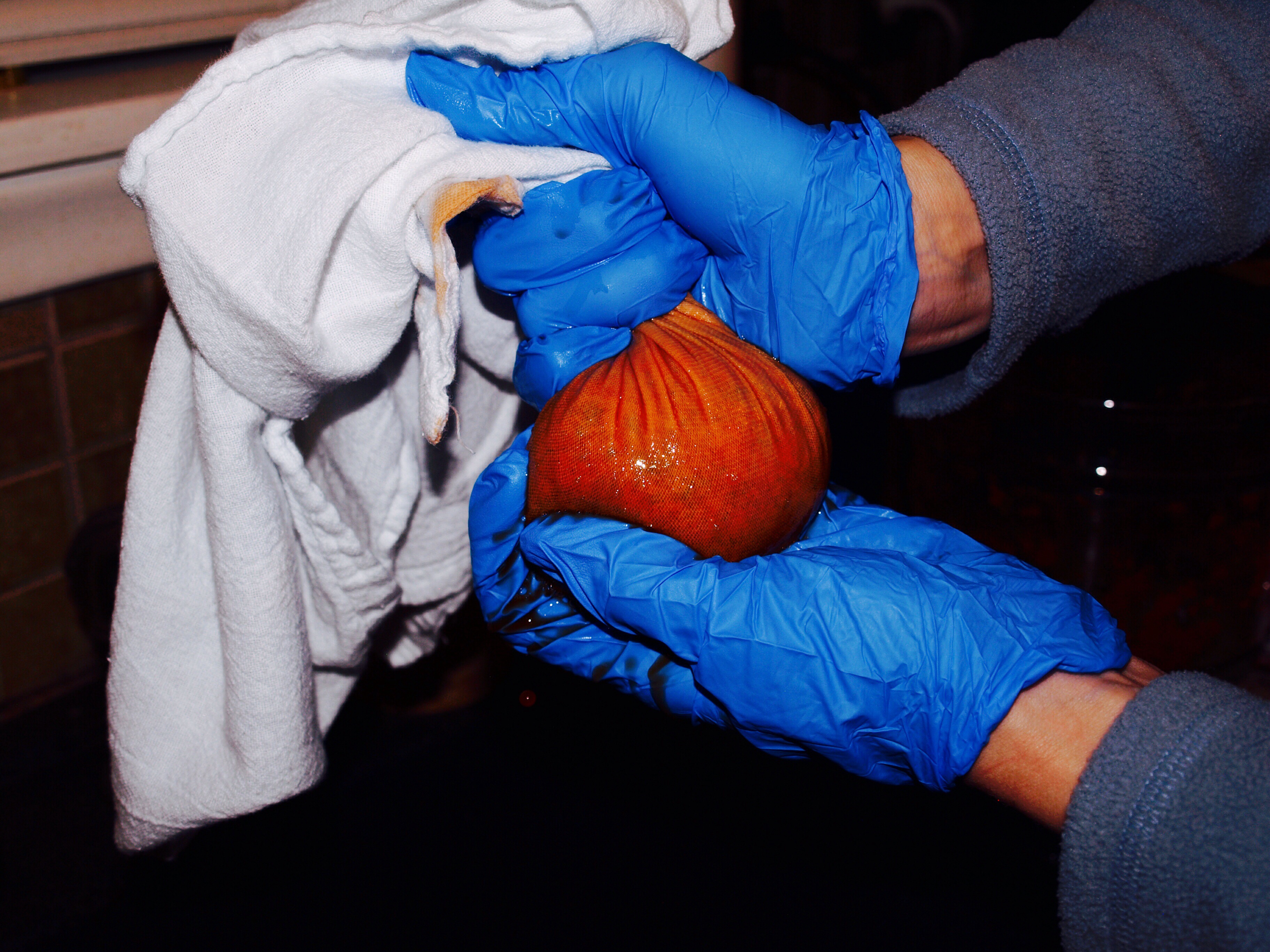 Next scrape the peppers into the center of a cheese cloth and wring the juice out. I love the red color! It makes the jelly look so pretty.