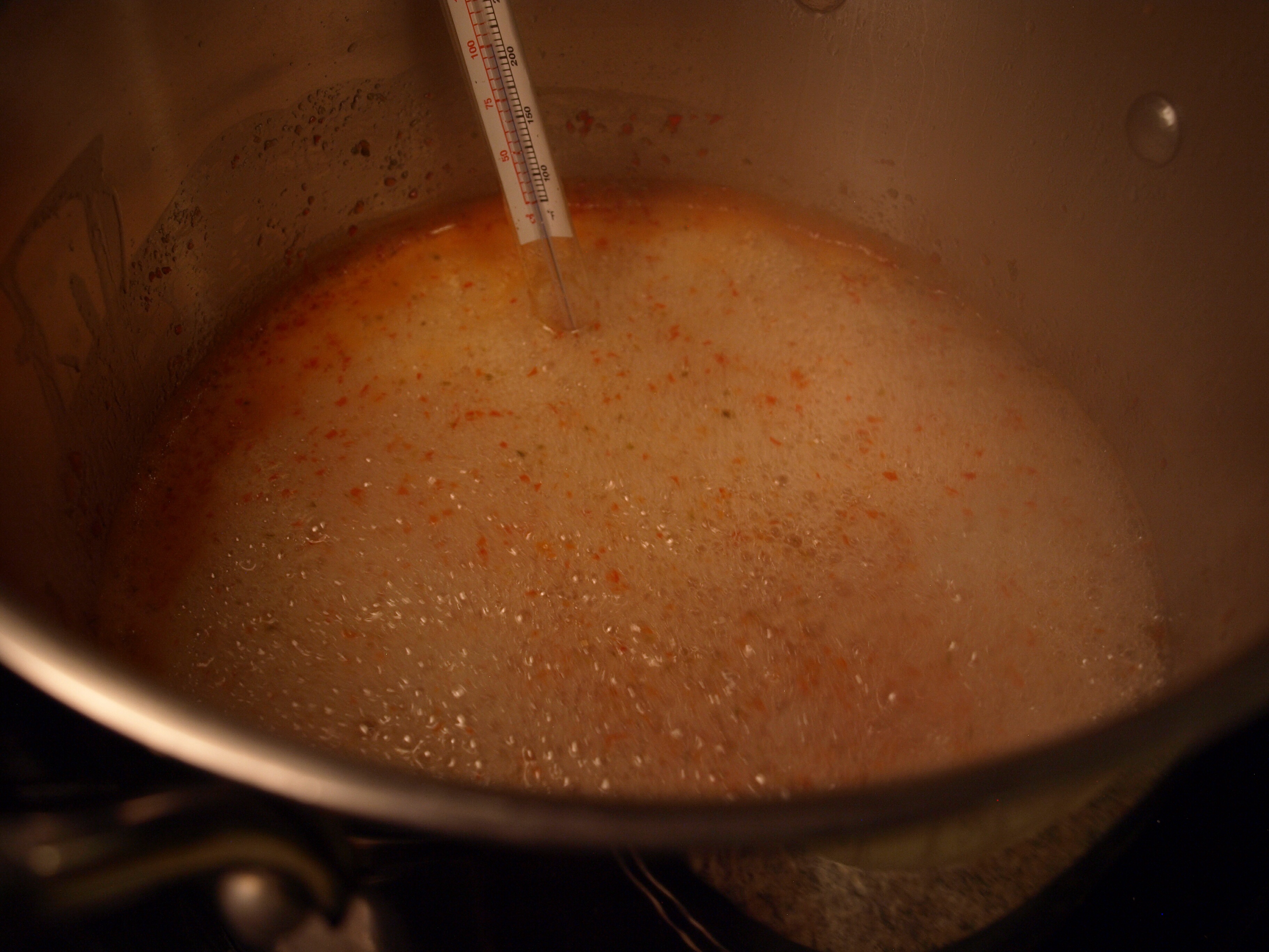 Add the pectin and bring back up to a boil. Use a candy thermometer if you have one to keep it at about 200-210 degrees for 10-15 minutes.