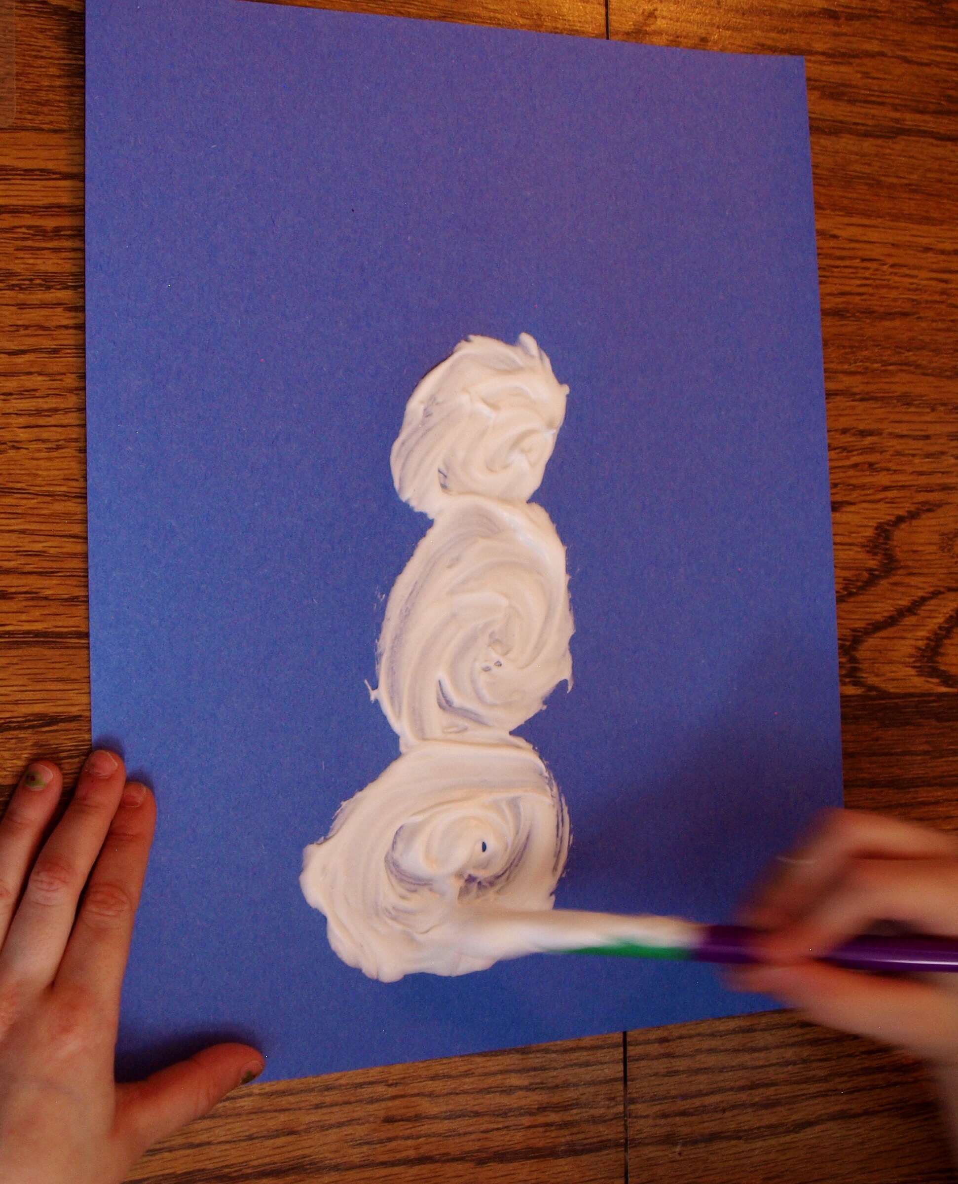 That’s all! Mix equal parts glue and shaving cream then sprinkle with glitter.
