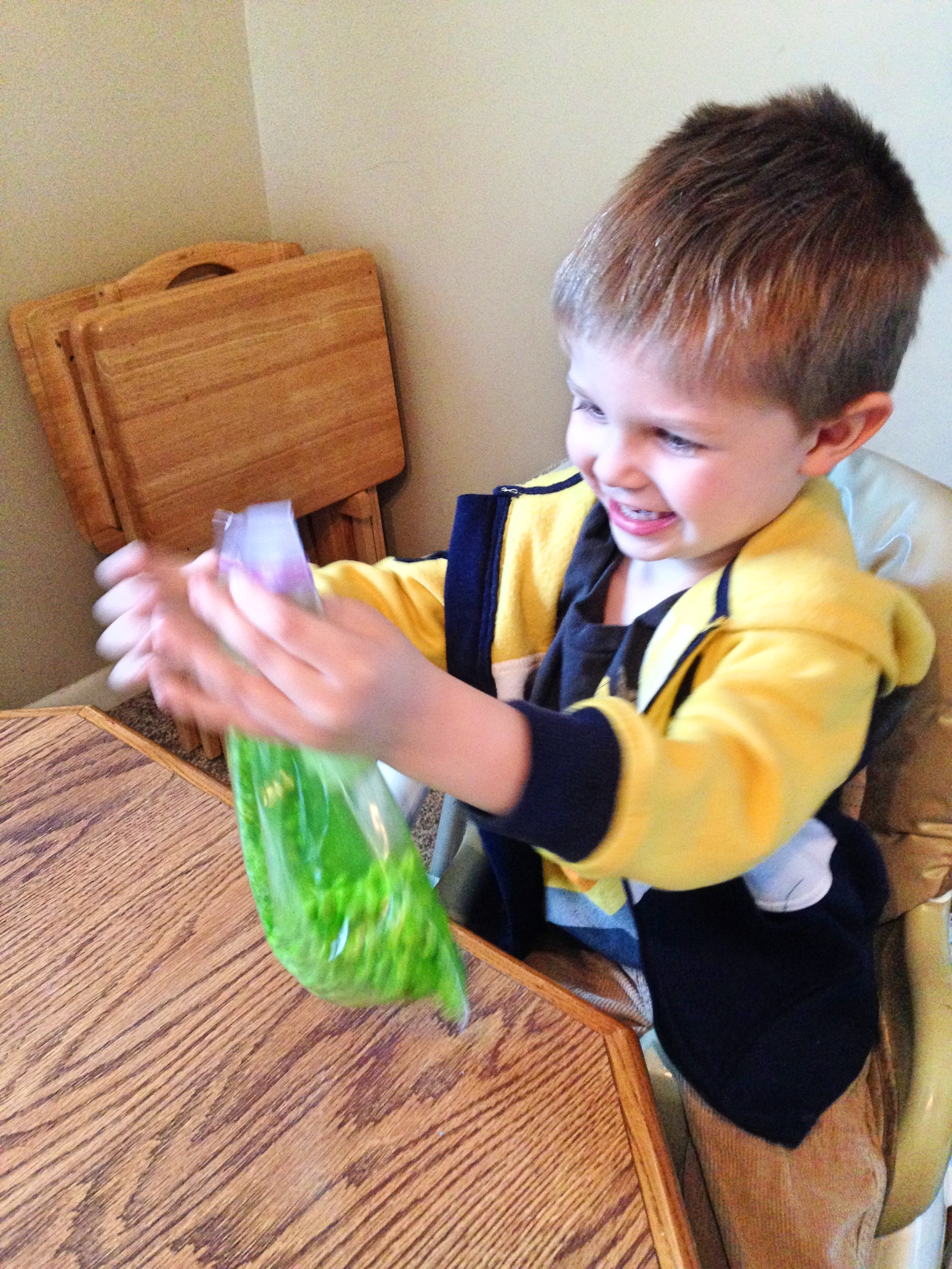 Then we put a cup of beans in a plastic zipper bag with 10-15 drops of neon food coloring.