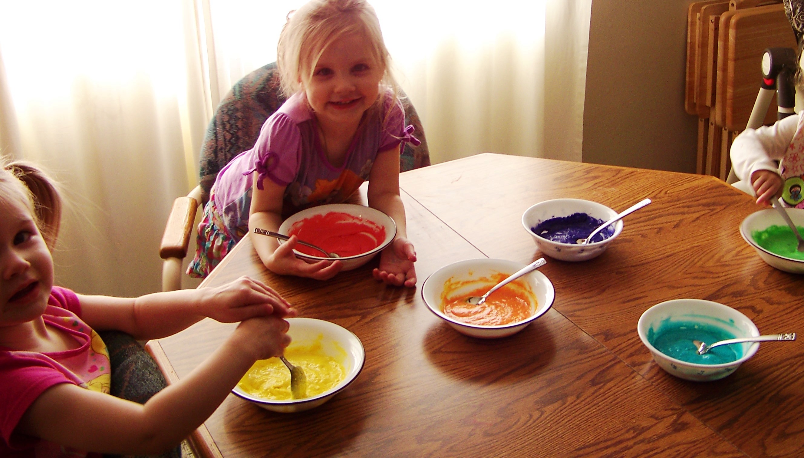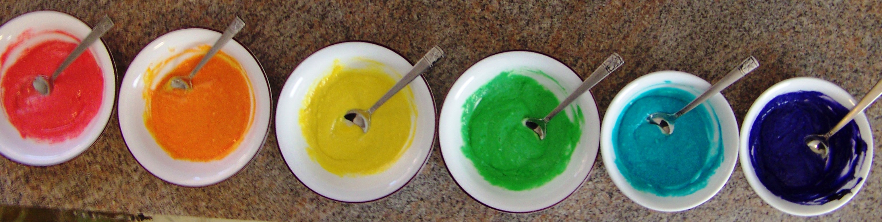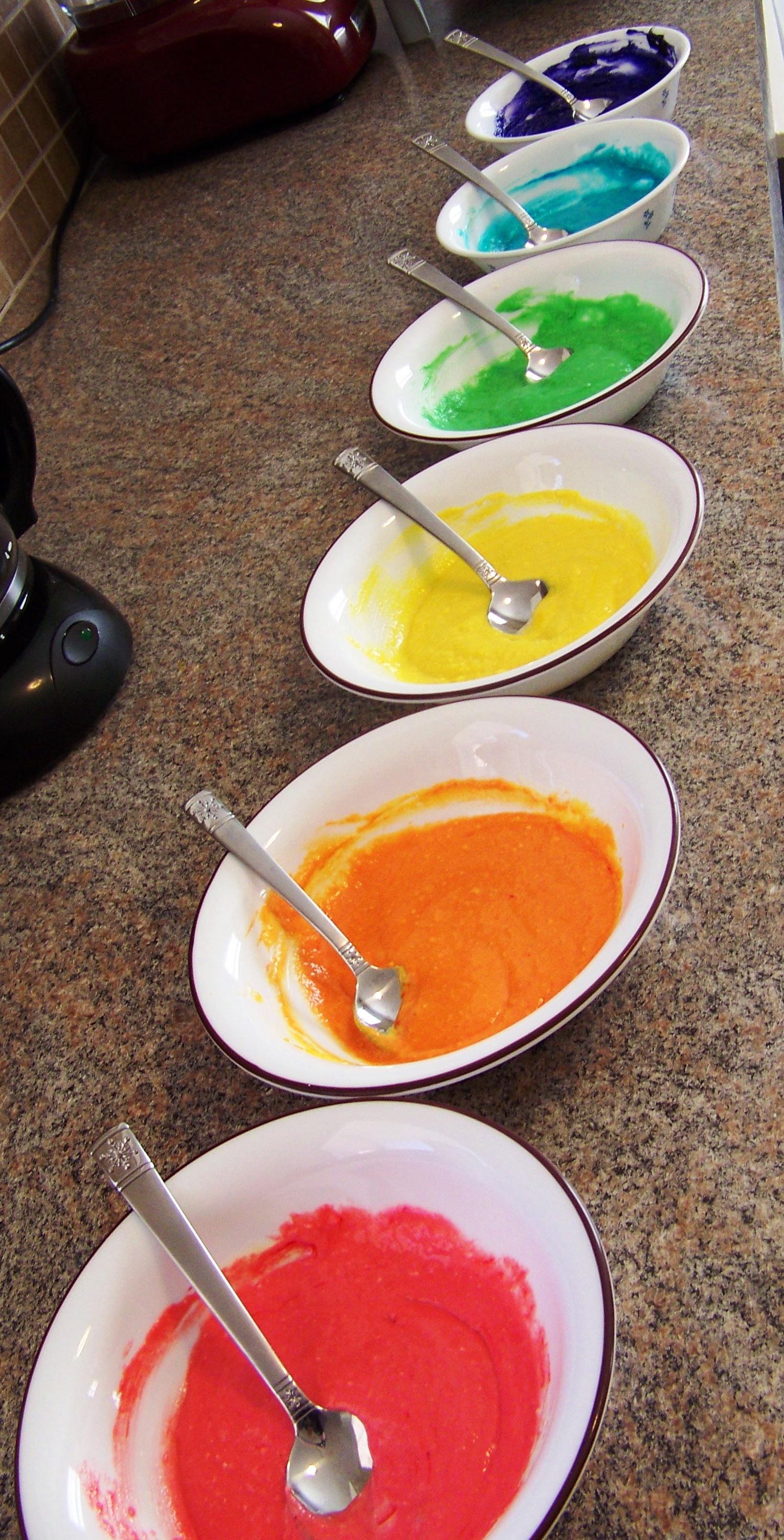 They make such a happy little stack of pancakes! First I put each color of the rainbow food coloring in a different bowl.