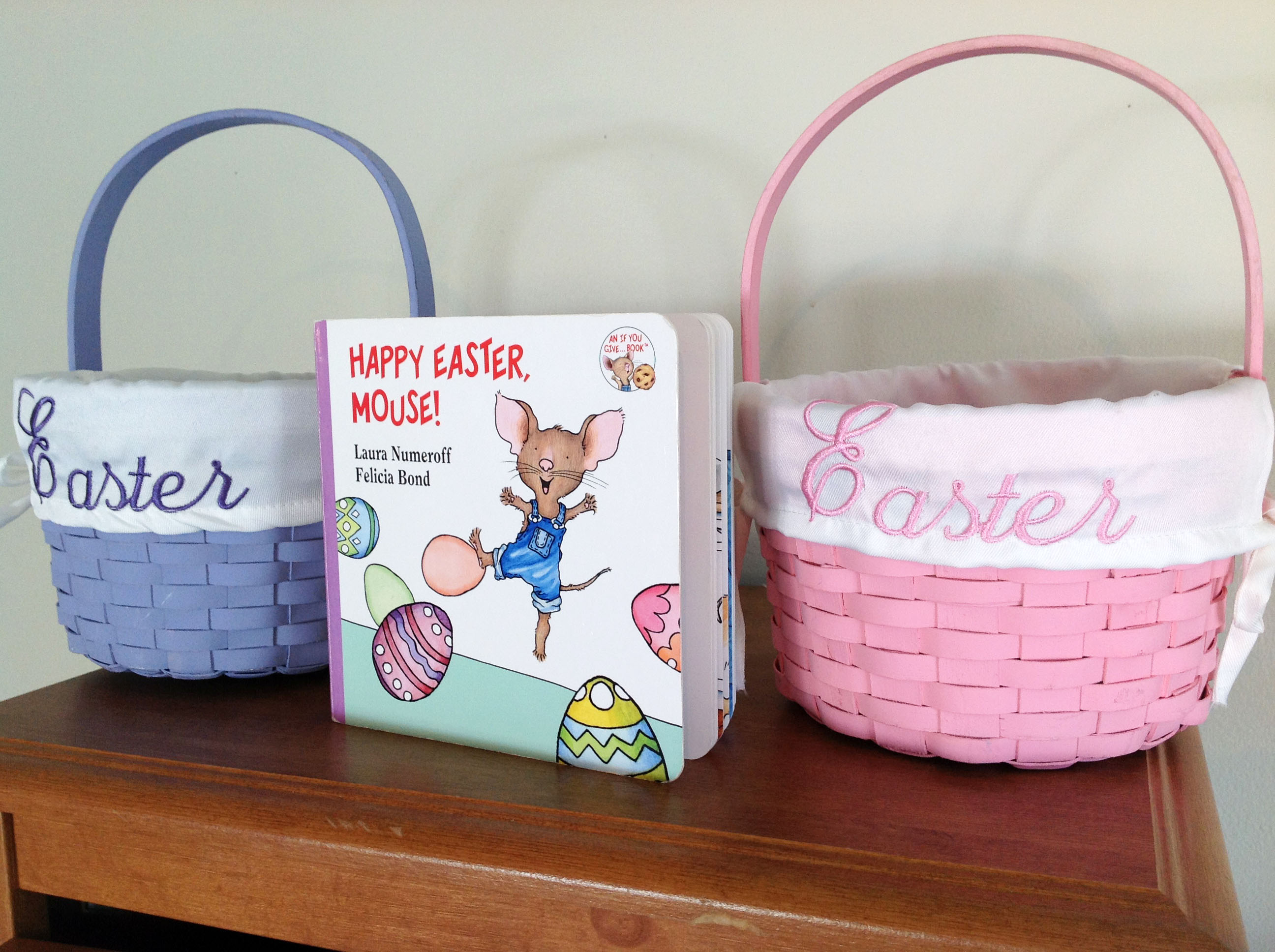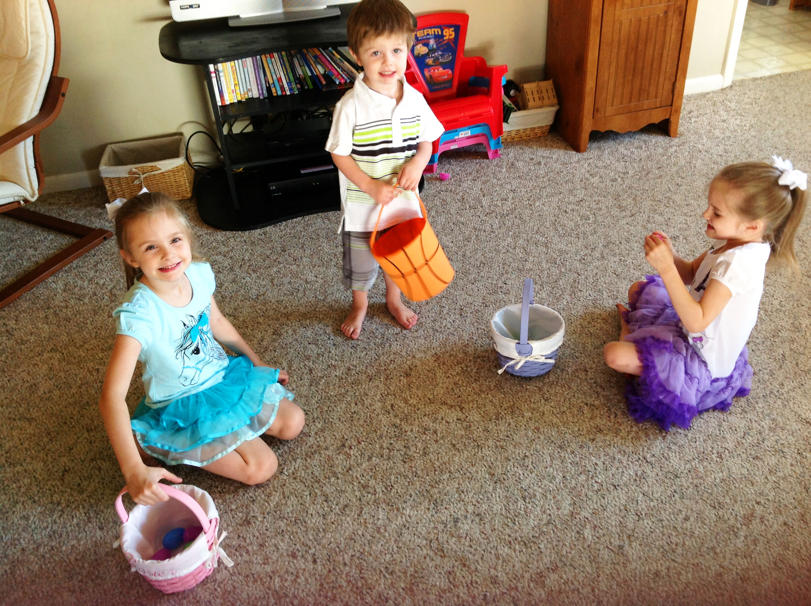 Then we used the eggs for a more traditional game. Hide the Easter eggs around the house (I like to do it outside but it was too chilly to stay out very long). First we read a book called “Happy Easter Mouse” and it gets them excited about egg hunting. I let one child hide while the other two hang out upstairs. Then the two that did not hide come down with their baskets and have fun searching for eggs. We always find all the eggs and then switch around roles so each child gets a turn to be the hider. I almost enjoy watching the one that hid more than the searchers. Usually hints are given and the excitement is contagious!