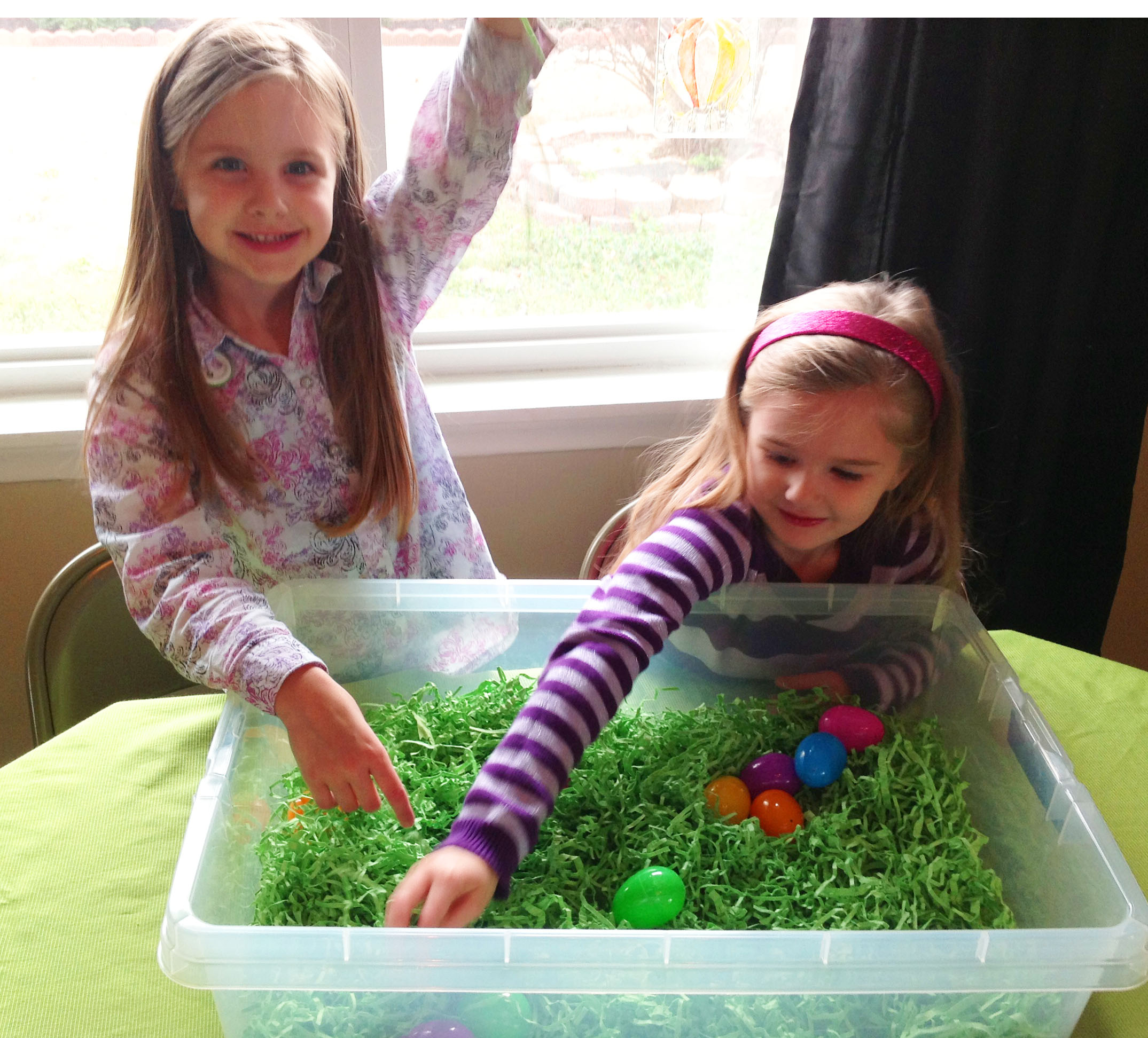 They stuffed the grass inside the eggs, just enjoyed running their fingers through the grass for texture, and hid the eggs under the grass. It made for a great 45 minute play time!