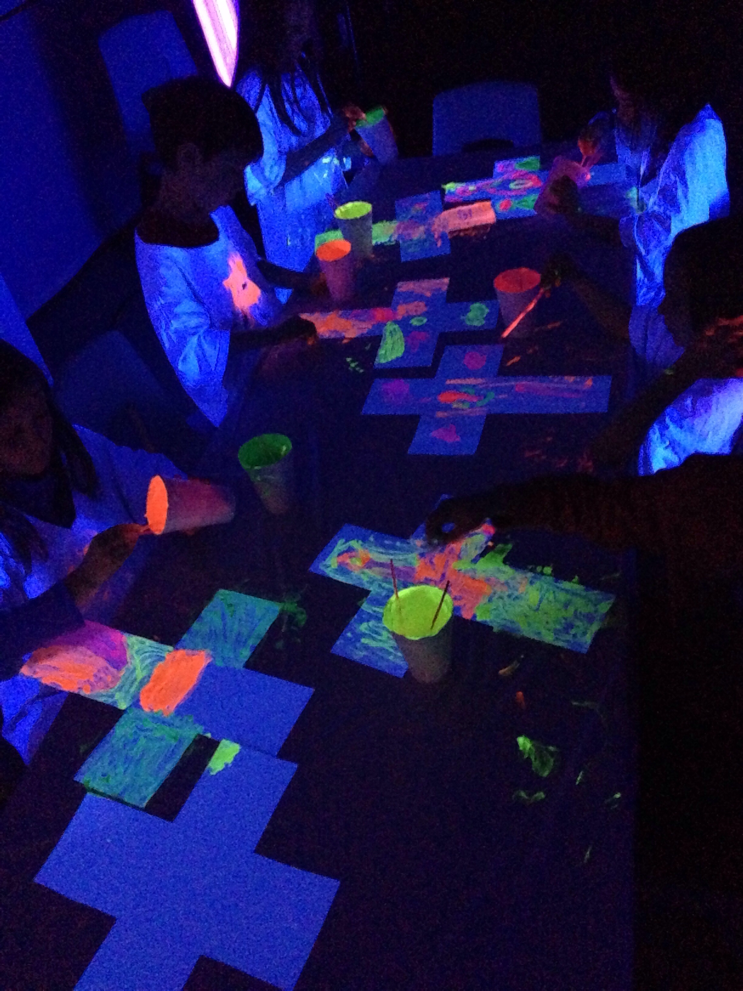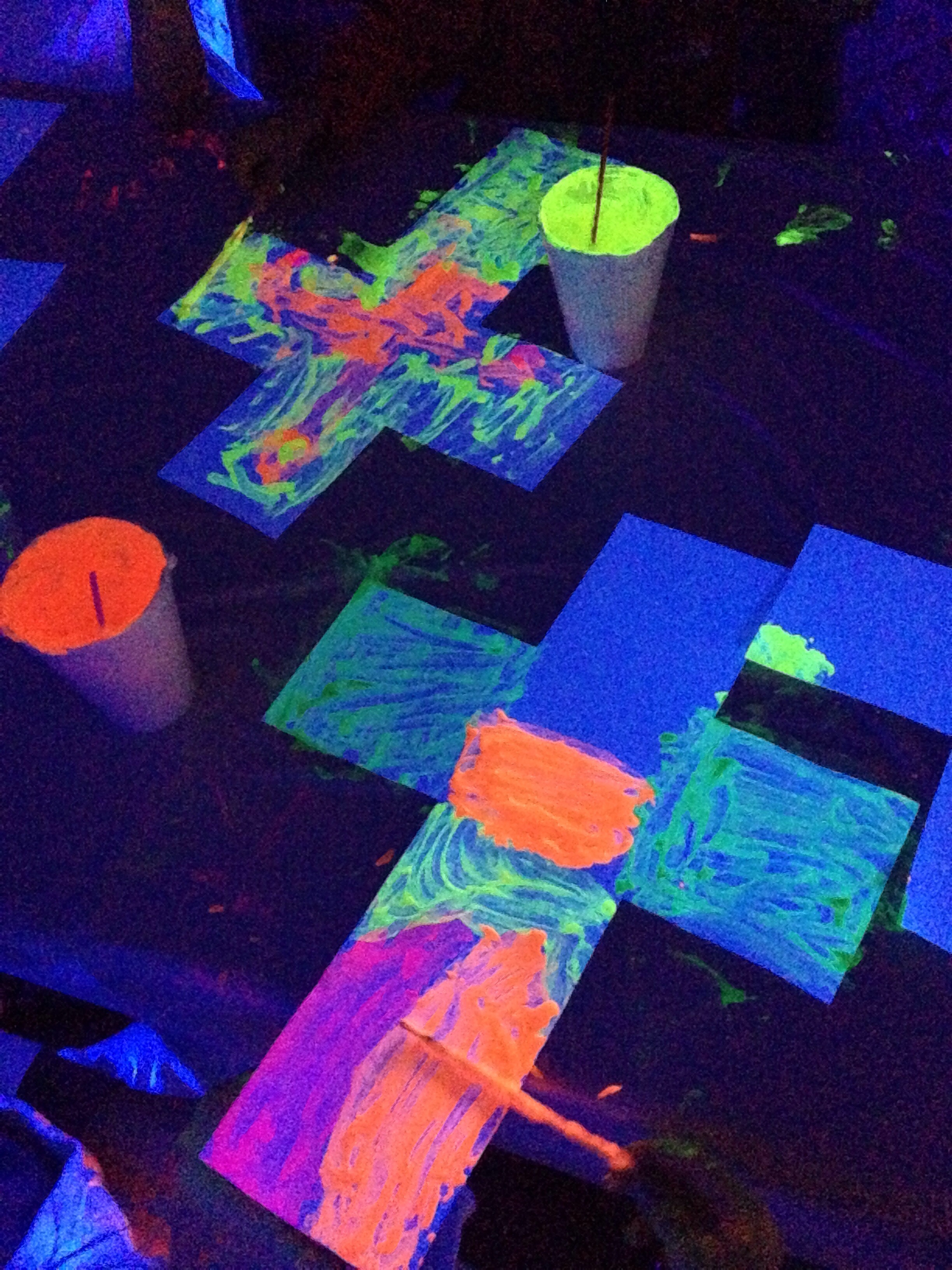To make the crosses I cut cross shapes from poster board and let the kids have fun painting them with the glow paint.