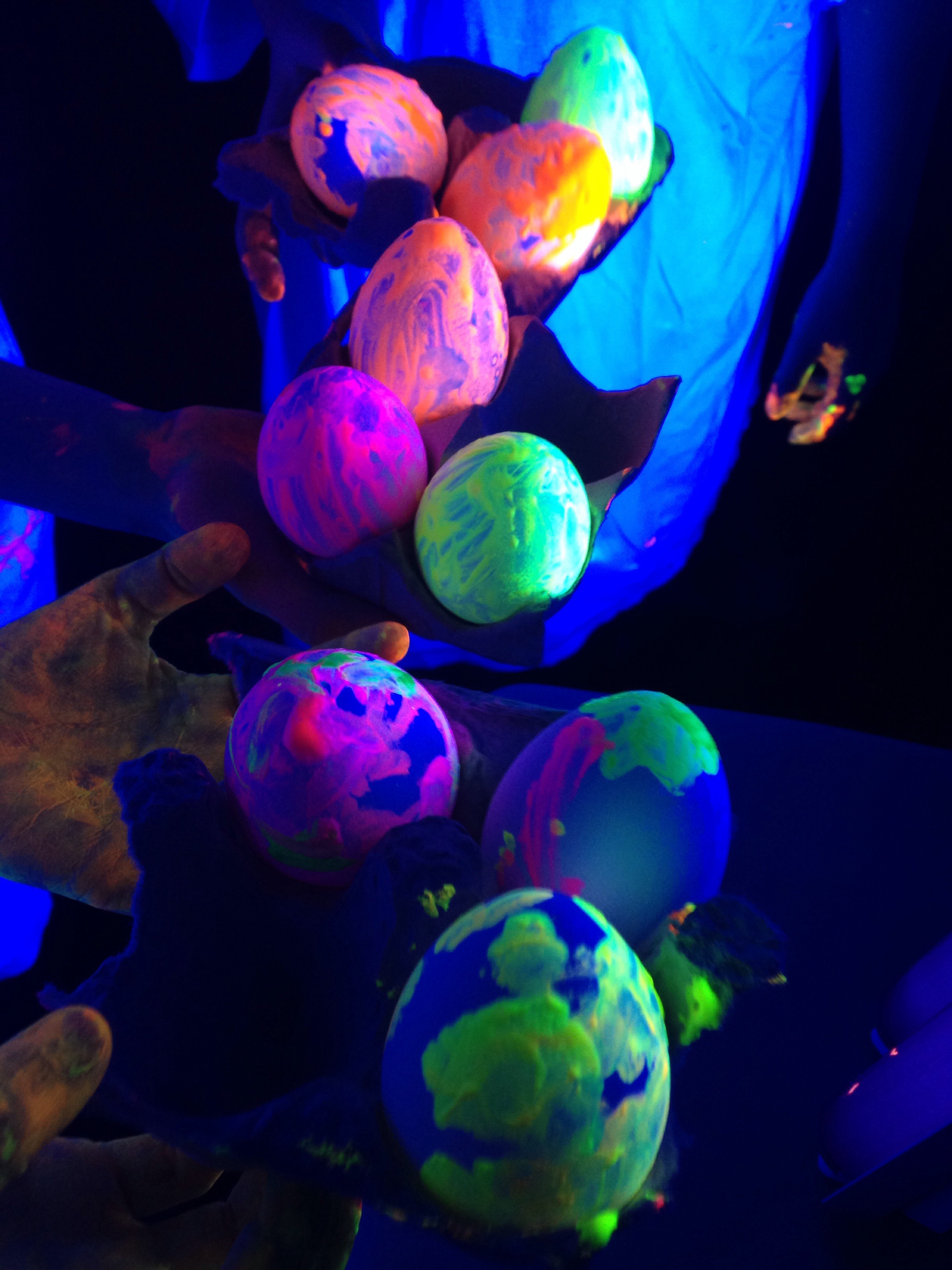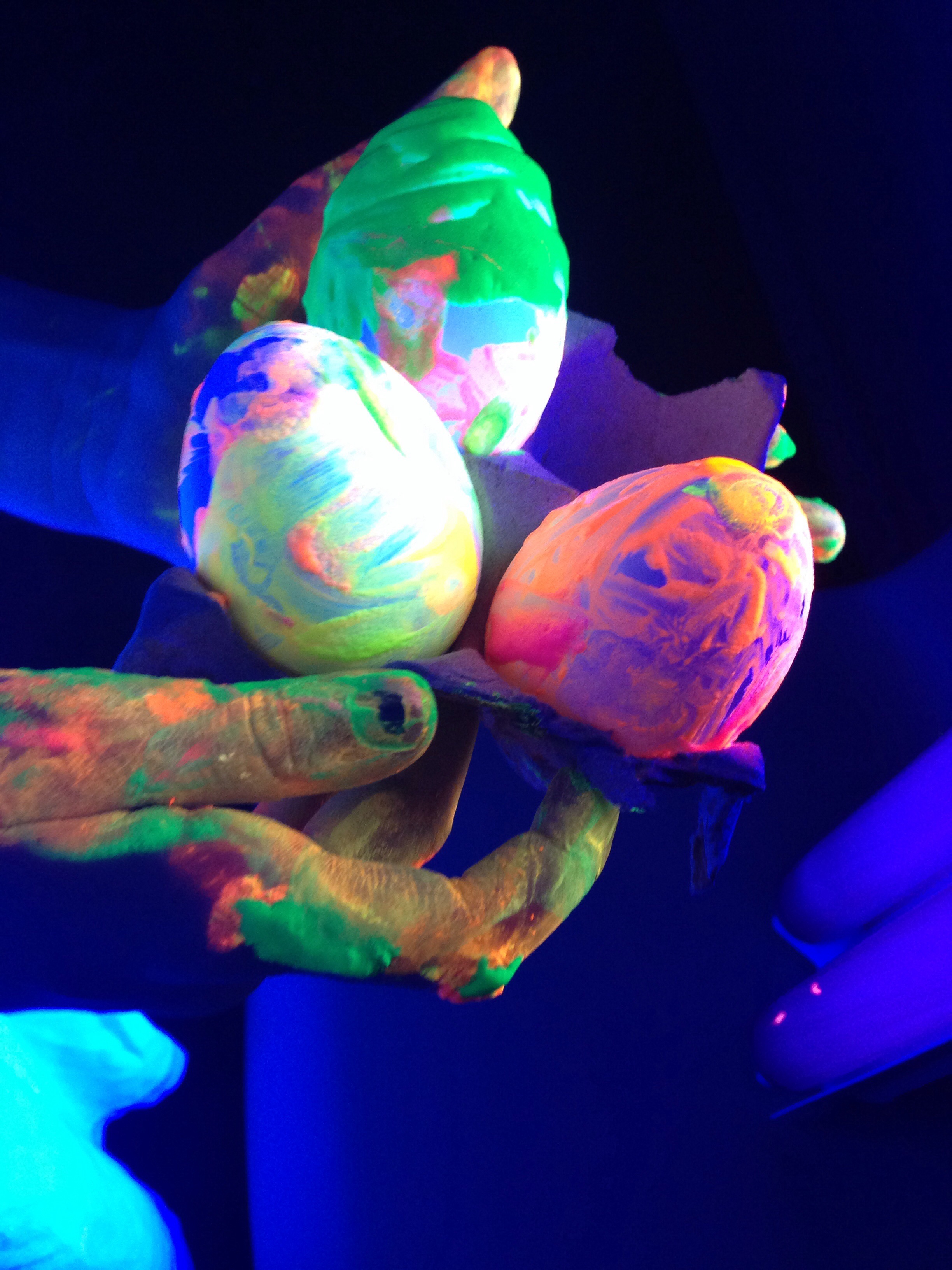They were at Walmart, plastic eggs that feel like real eggs and are completely dyeable! They were cheap too, $1.97 for 1 dozen! Less trouble, less time, less breakable, less money…. um, yes I will take four dozen please! Each student got three eggs to paint with the glow paint.