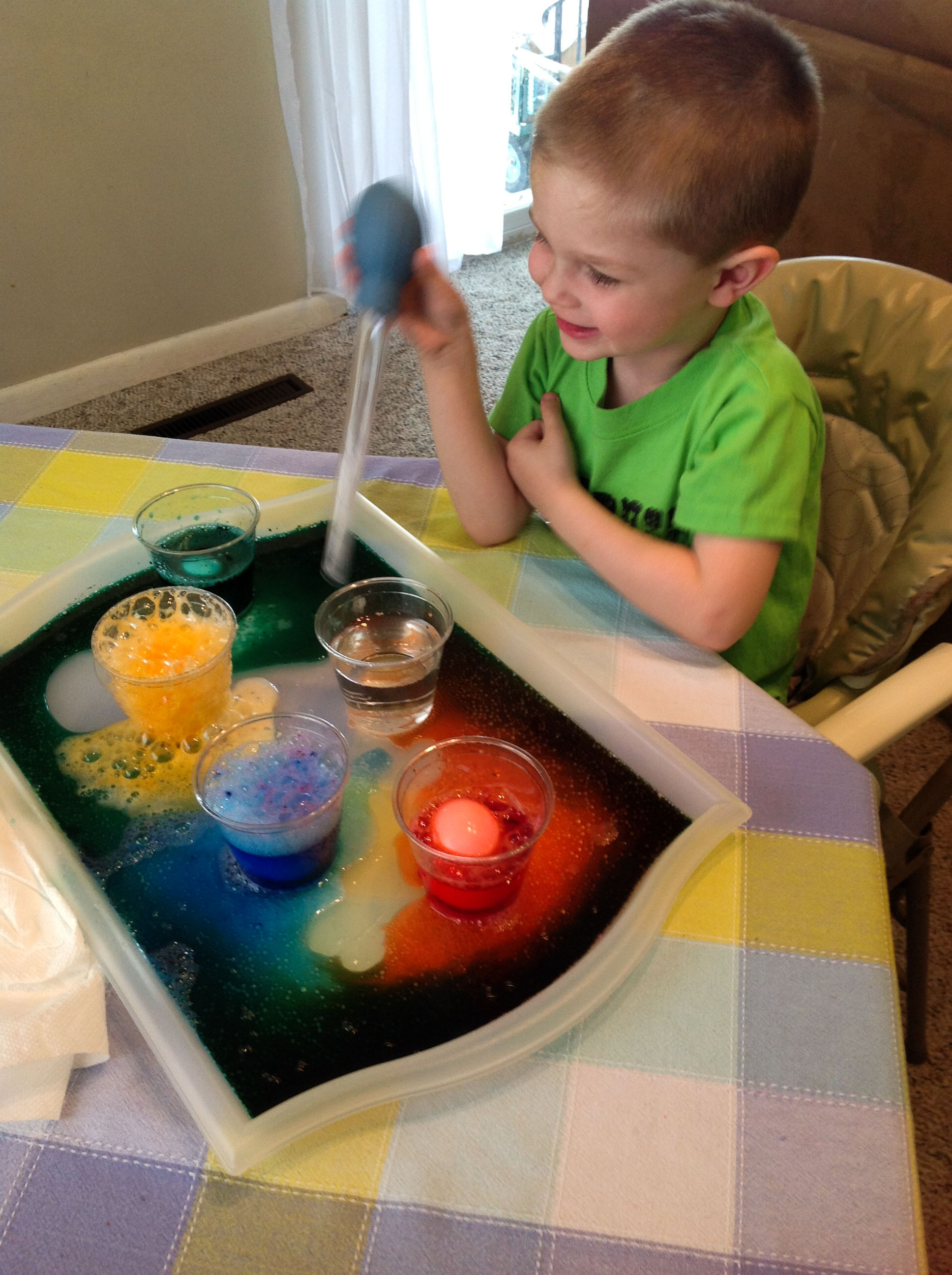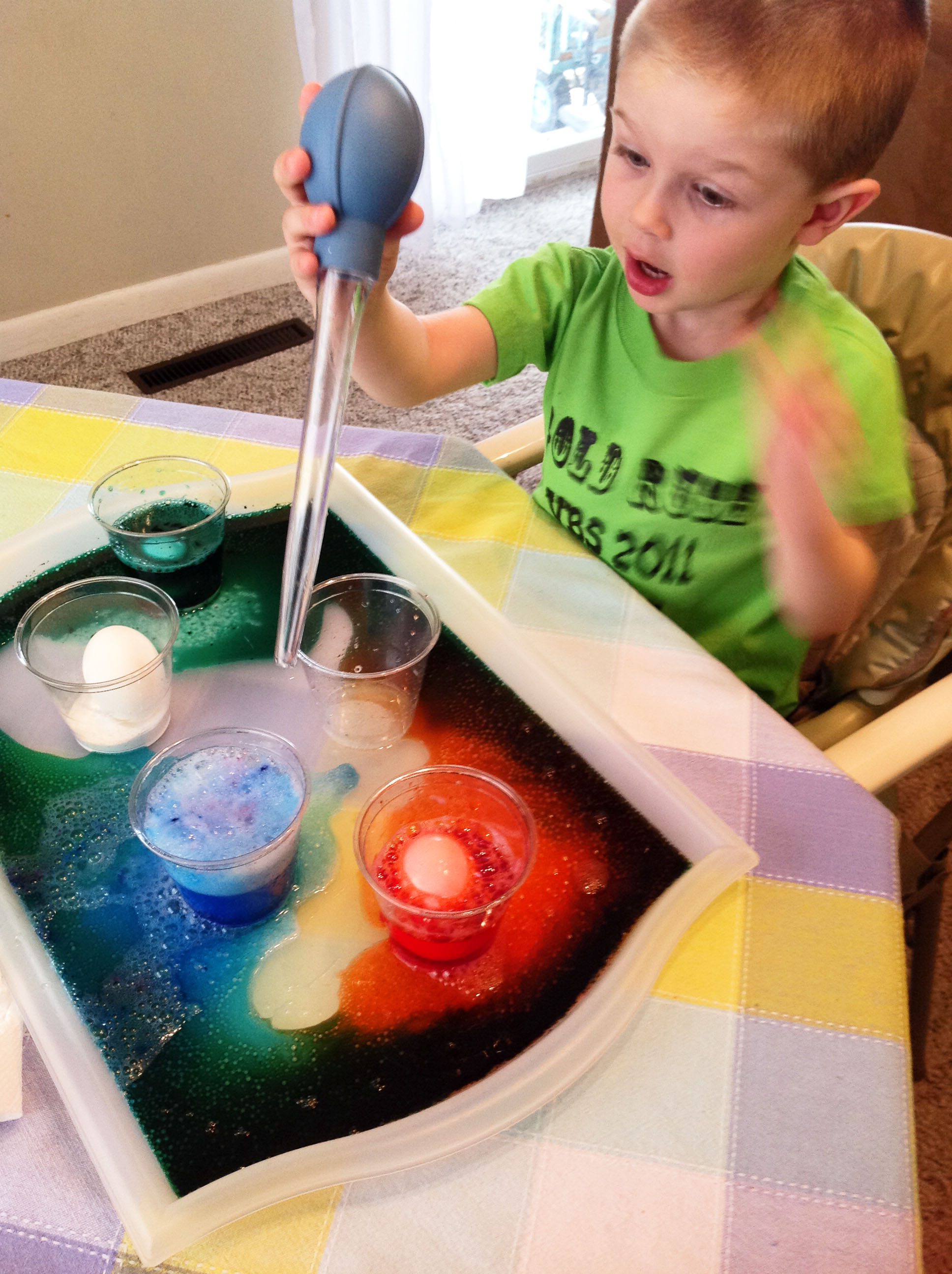 I let them take turns choosing a cup to put their eggs in and using the baster to drop vinegar into them. The excitement was contagious, and it turned out to be a really fun way to dye eggs!