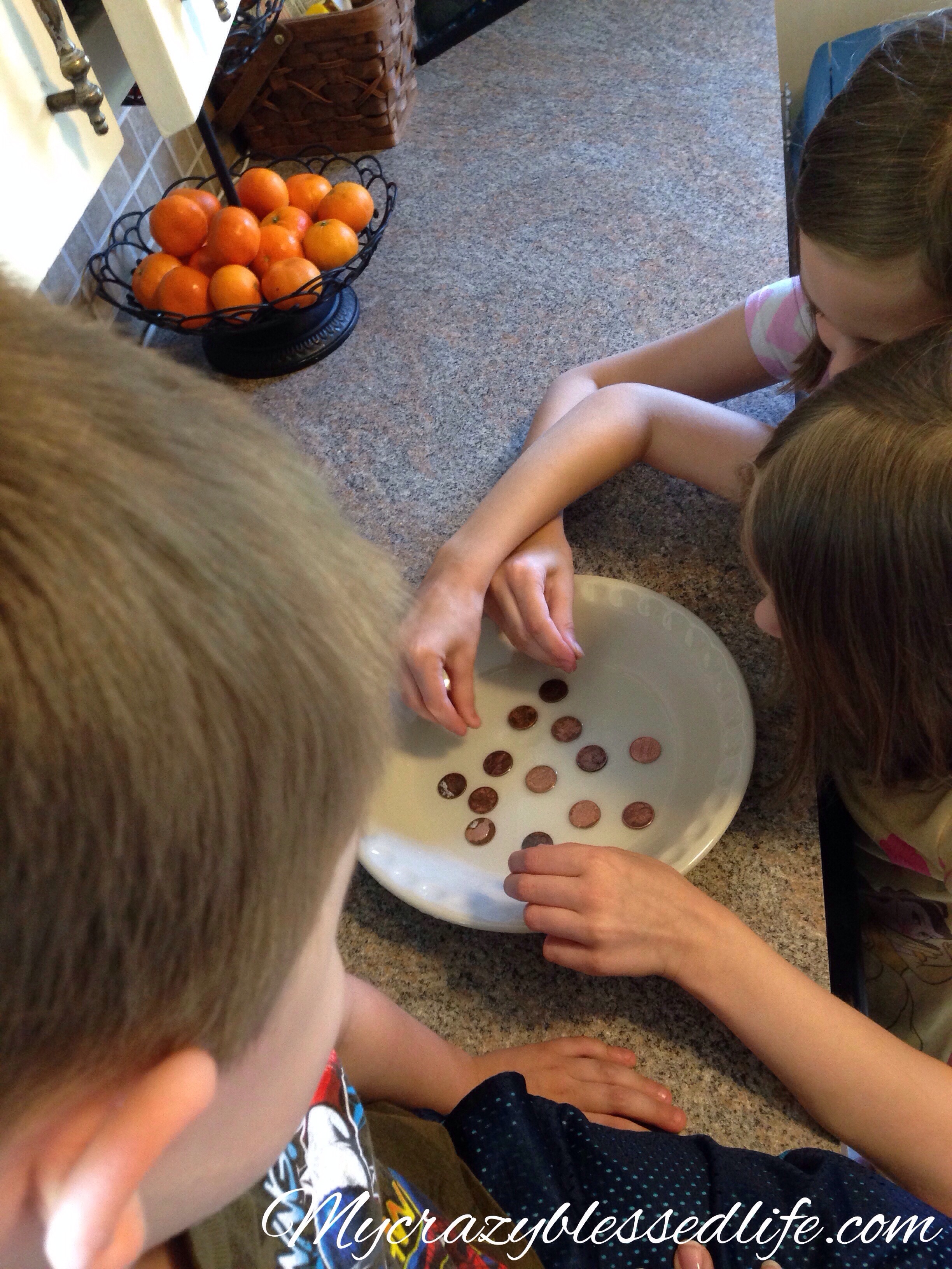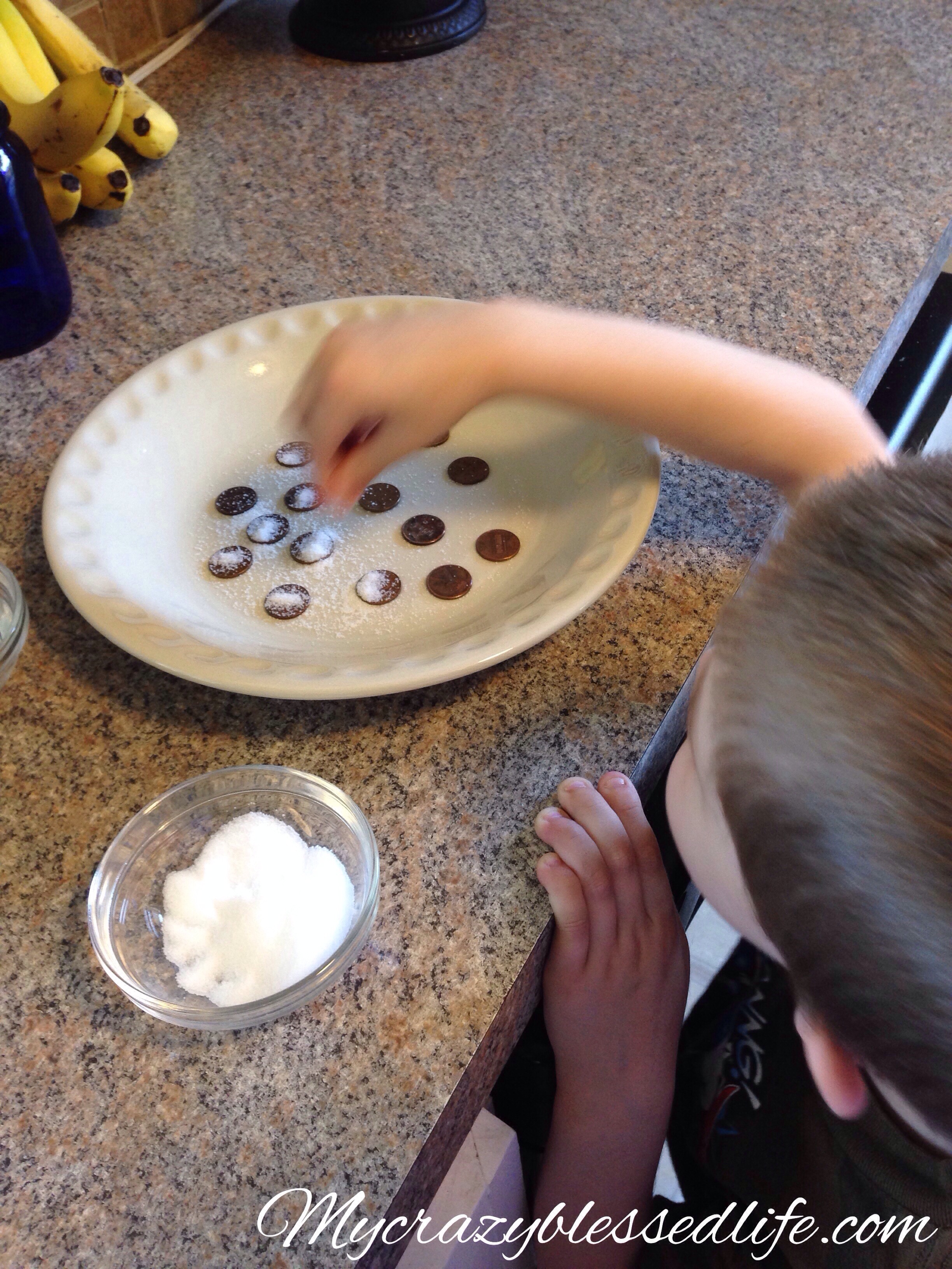 First I let the kids try to wash the pennies in the soapy water. It didn’t work of course 🙂