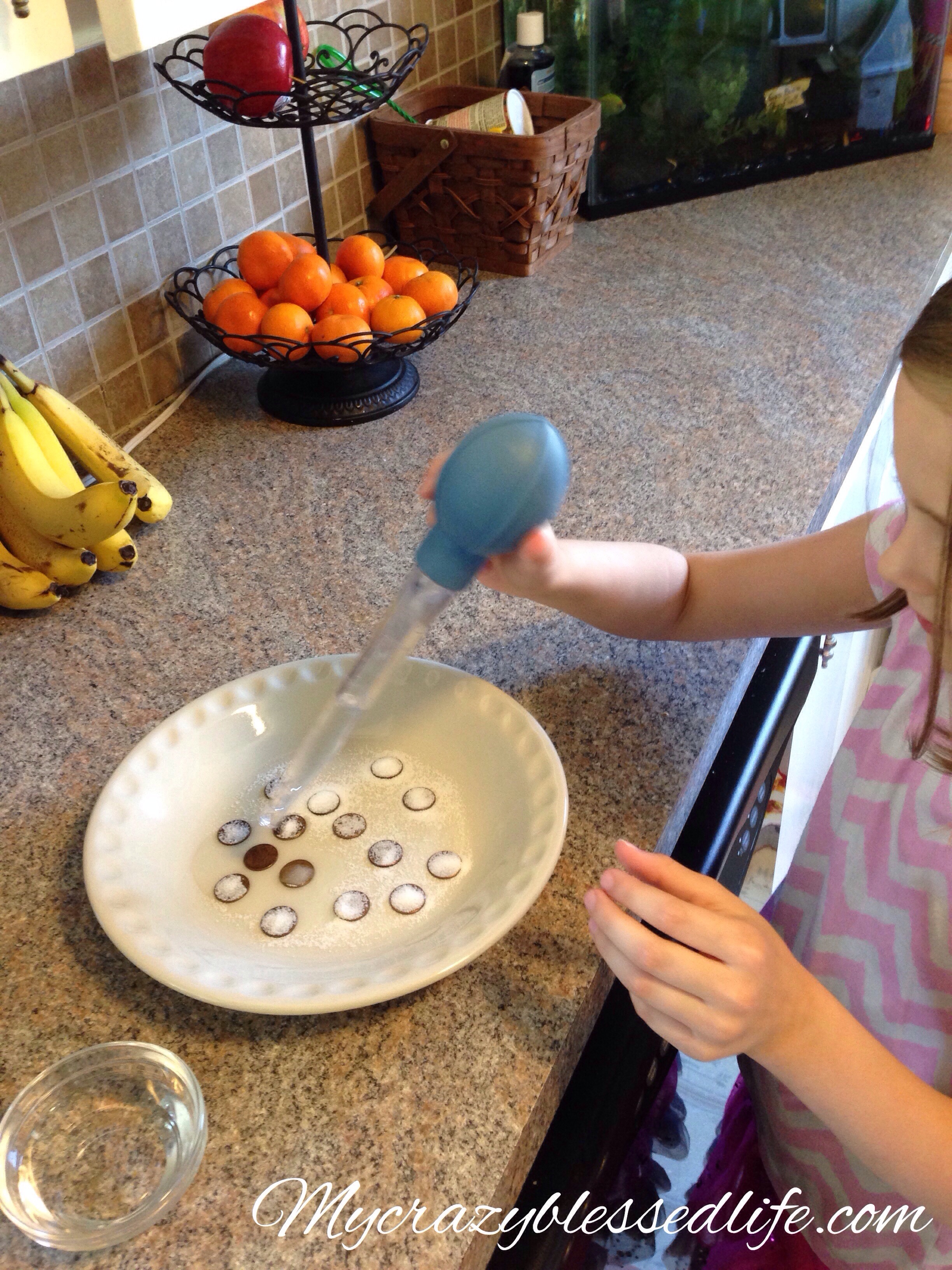 First I dug around for dirty pennies (seems that’s all I had in my wallet ha!). Then you will need soapy water (optional), vinegar, salt and a dropper. We only had a turkey baster, one of these days I will get a cute little dropper for our science experiments! This is what my set up looked like: