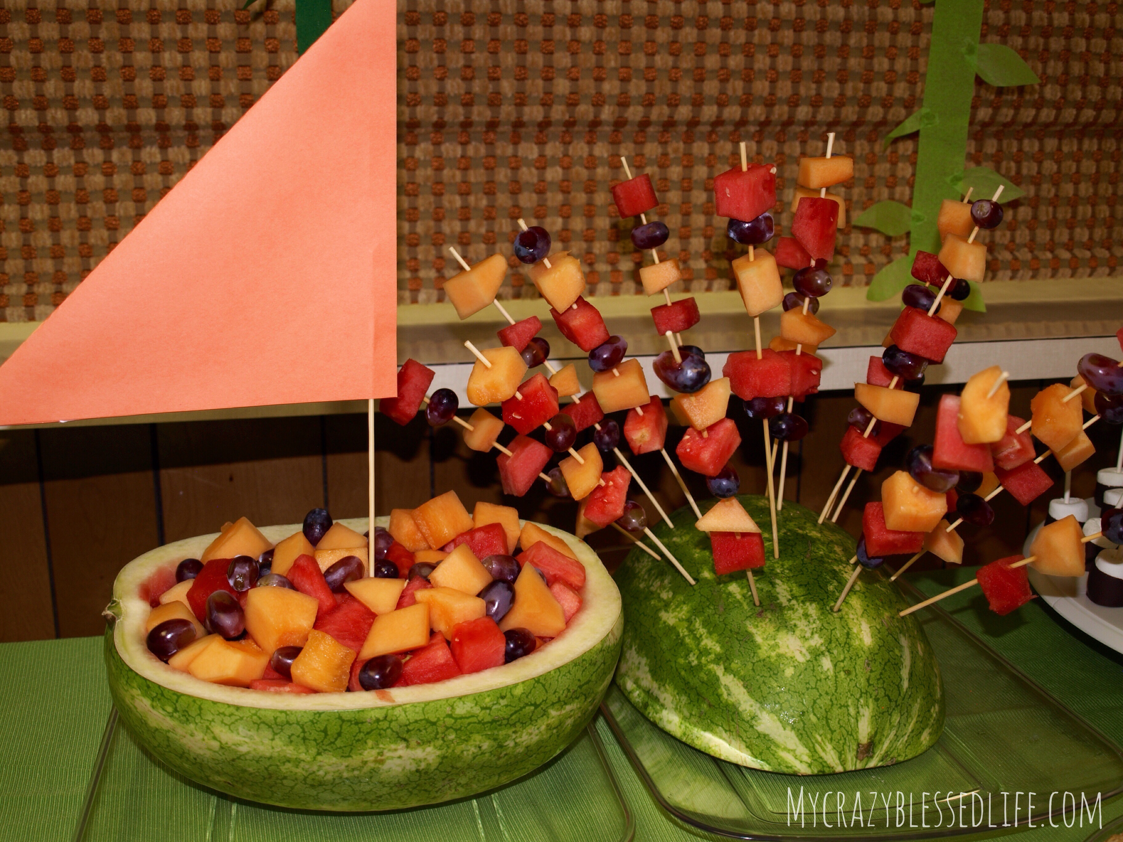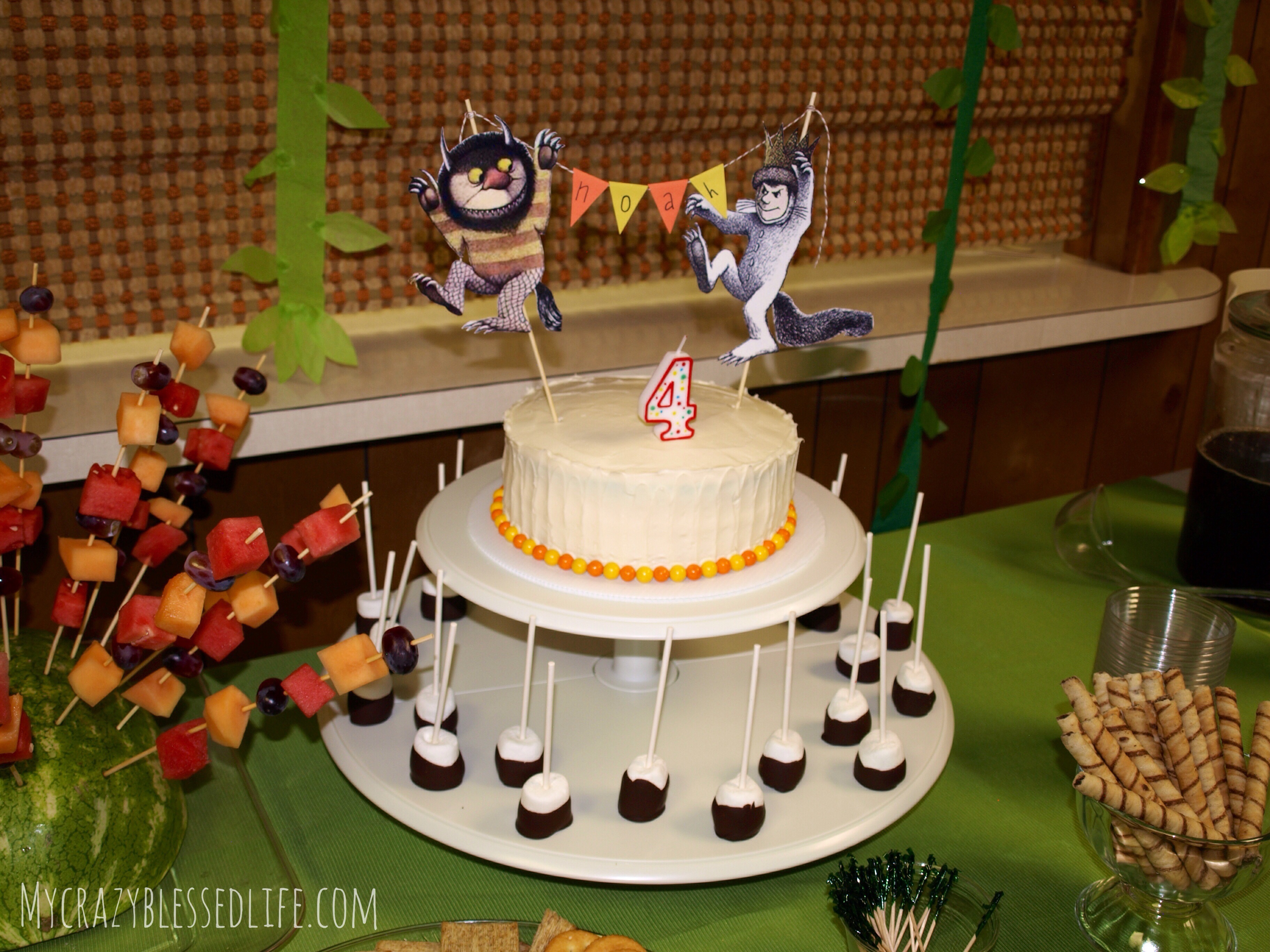 Here is the food table more up close, it is full of Noah’s favorite foods requested just for his birthday dinner. We had Homemade Chicken and Noodles, Corn on the Cob, Rolls, Cheese and Crackers, and Fruit. The watermelon I cut to look like Max’s boat and the wild things island covered in fruit kabob trees (from the book). I made a super yummy slushy punch, which I might share the recipe on the blog later this week. Then of course the cake! Along with chocolate dipped marshmallows and his favorite stick cookies.