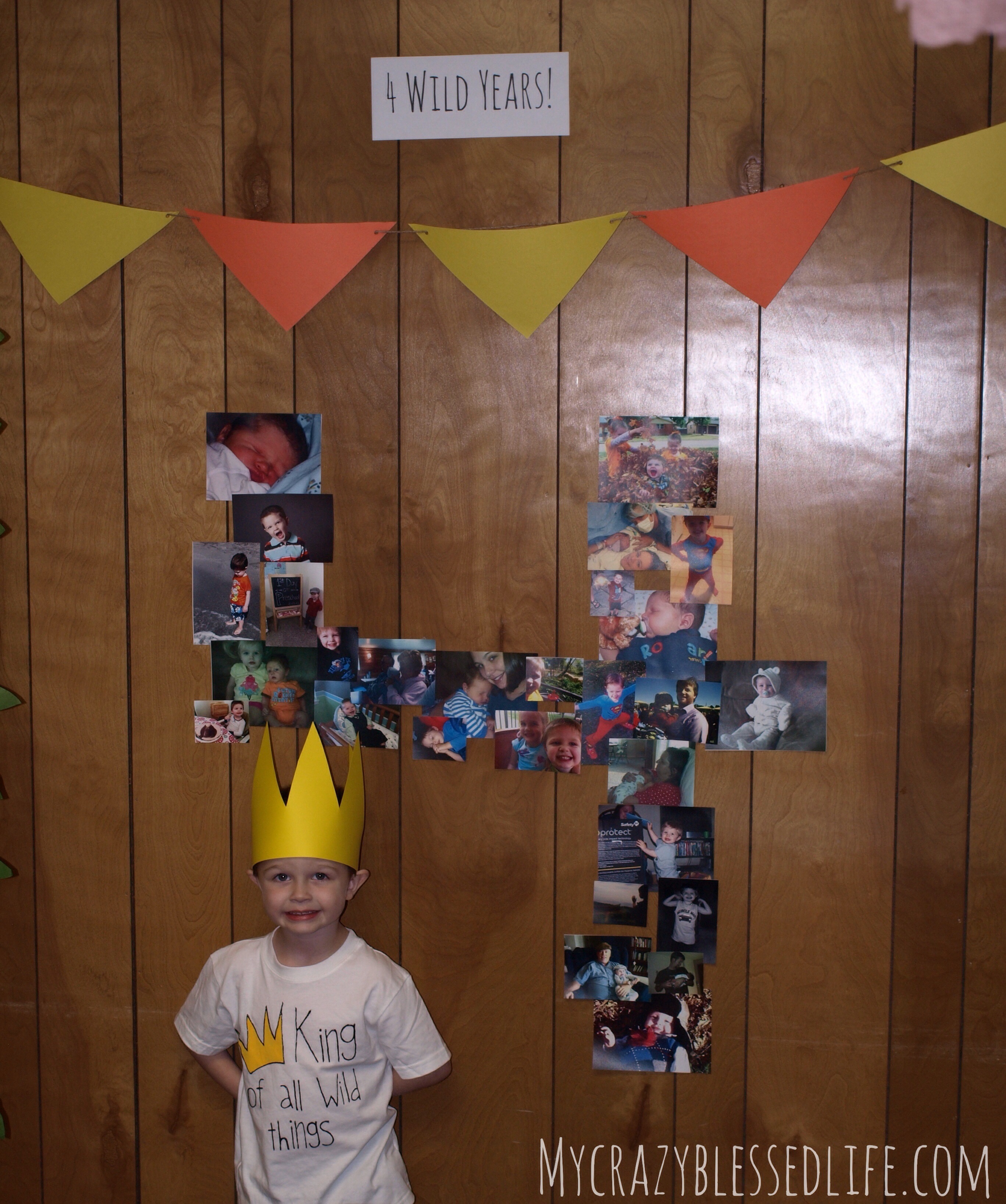 I made yellow and orange bunting based off of his favorite wild thing, Moishe. I hung it around the room and then echoed it on the cake as well. I also made a photo collage of from birth till now in the shape of a 4. Above it I made a sign that says, “4 WILD YEARS!”