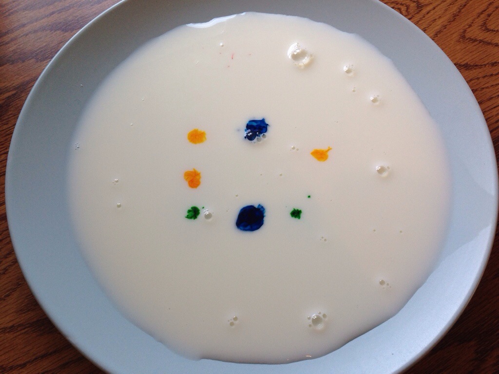 Next drop a few drops of food coloring into your milk.