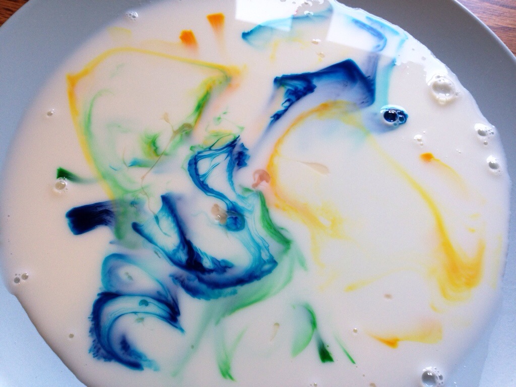 Seriously that’s all you need! My littles love easy experiments that they can do themselves. First pour milk in your plate.