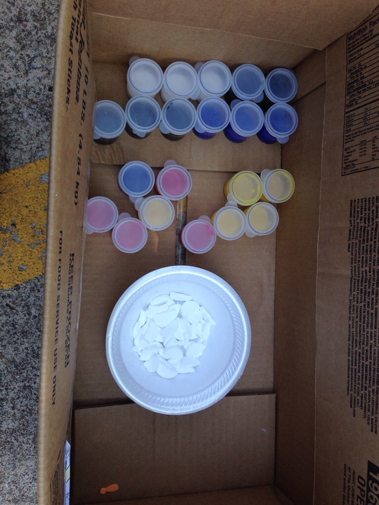 I filled pop top canisters similar to the old film canisters with watered down paint. I got 6 for a dollar at the dollar tree. Then cut alka seltzer tabs in half.