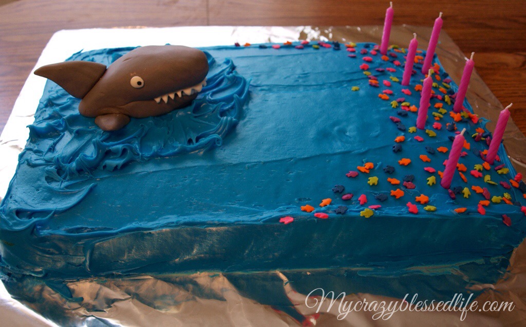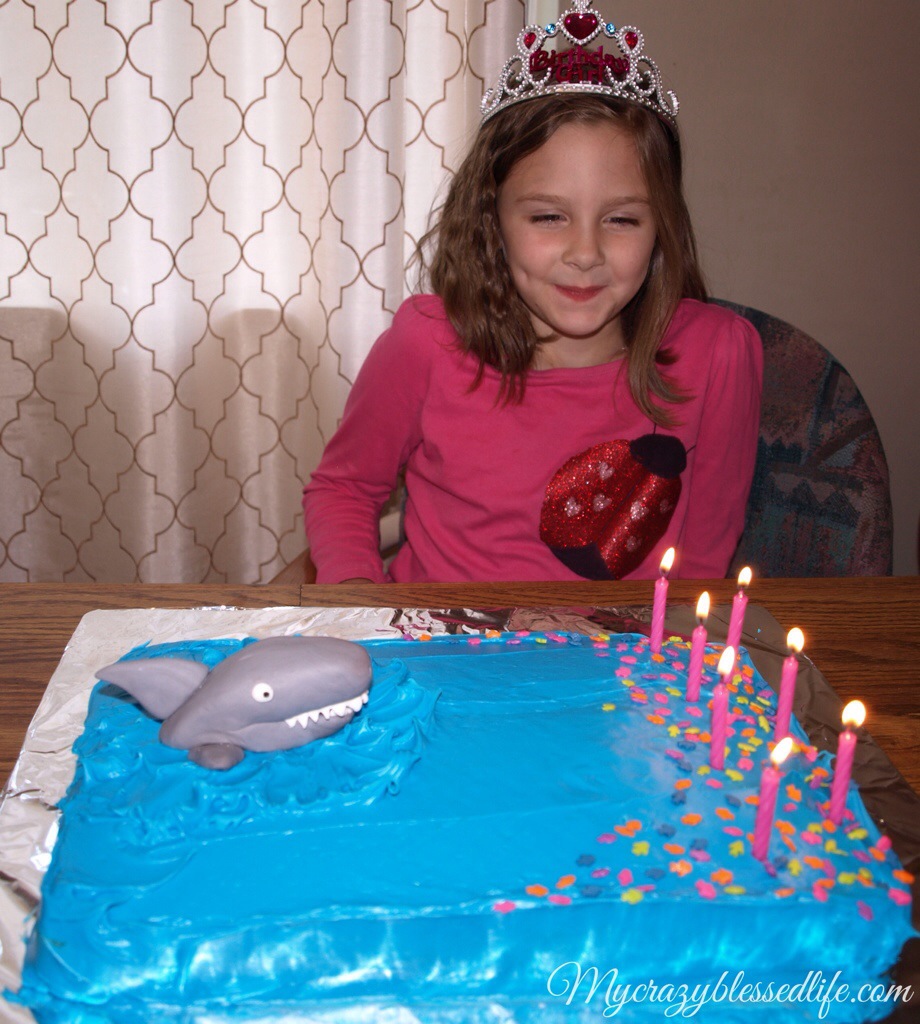 This year Katie helped me bake the cake, choose the design and help decorate. She loved doing it and I must say I had a blast baking and laughing with my girl all morning. I am so blessed to be this little girl’s momma. She loved that Shark Week coincides with her birthday this year and wanted a shark cake. She explained that she already had a “pretty cake” at her party and needed a fun cake on her birthday 🙂 best of both worlds for my girl!