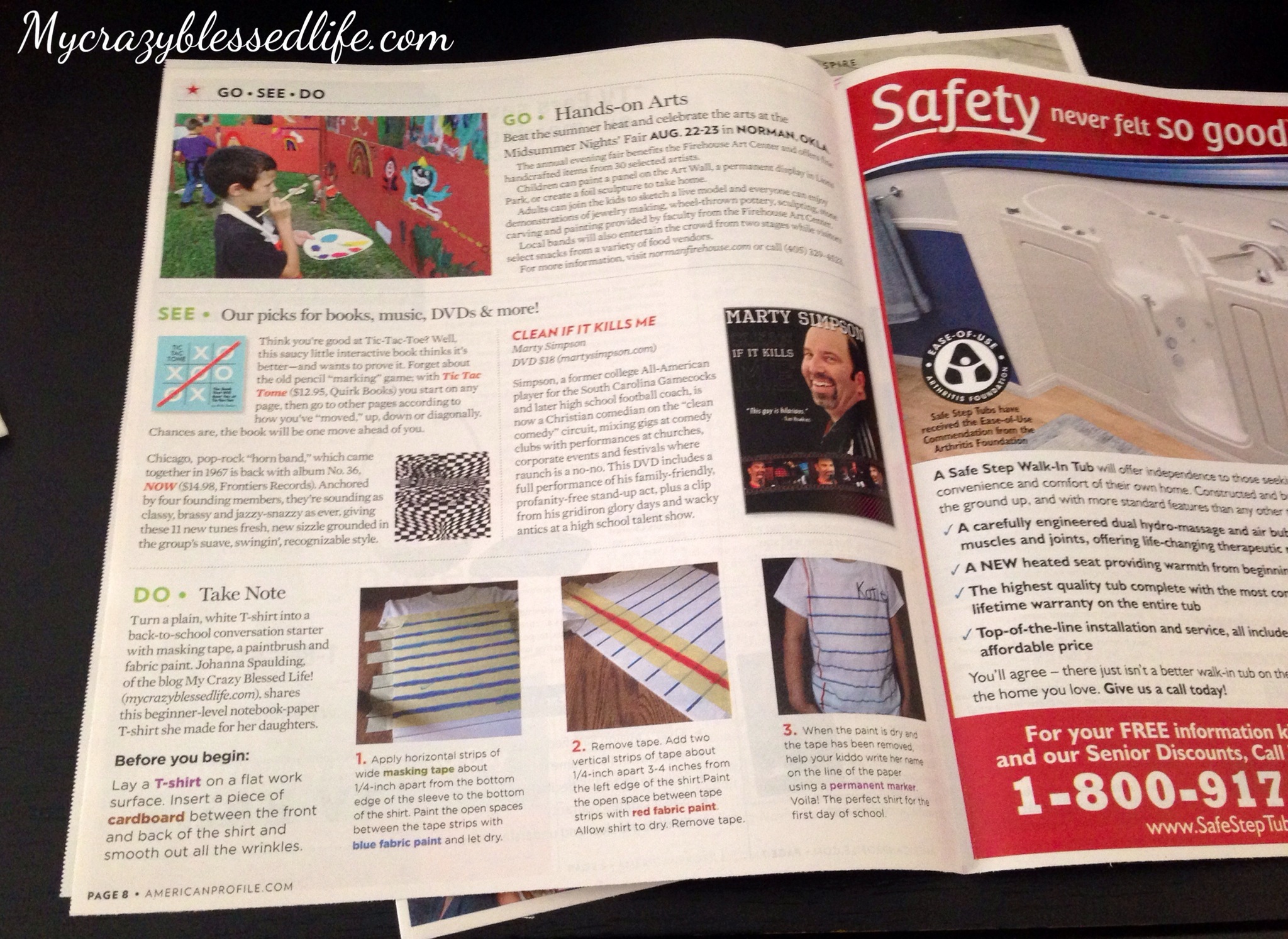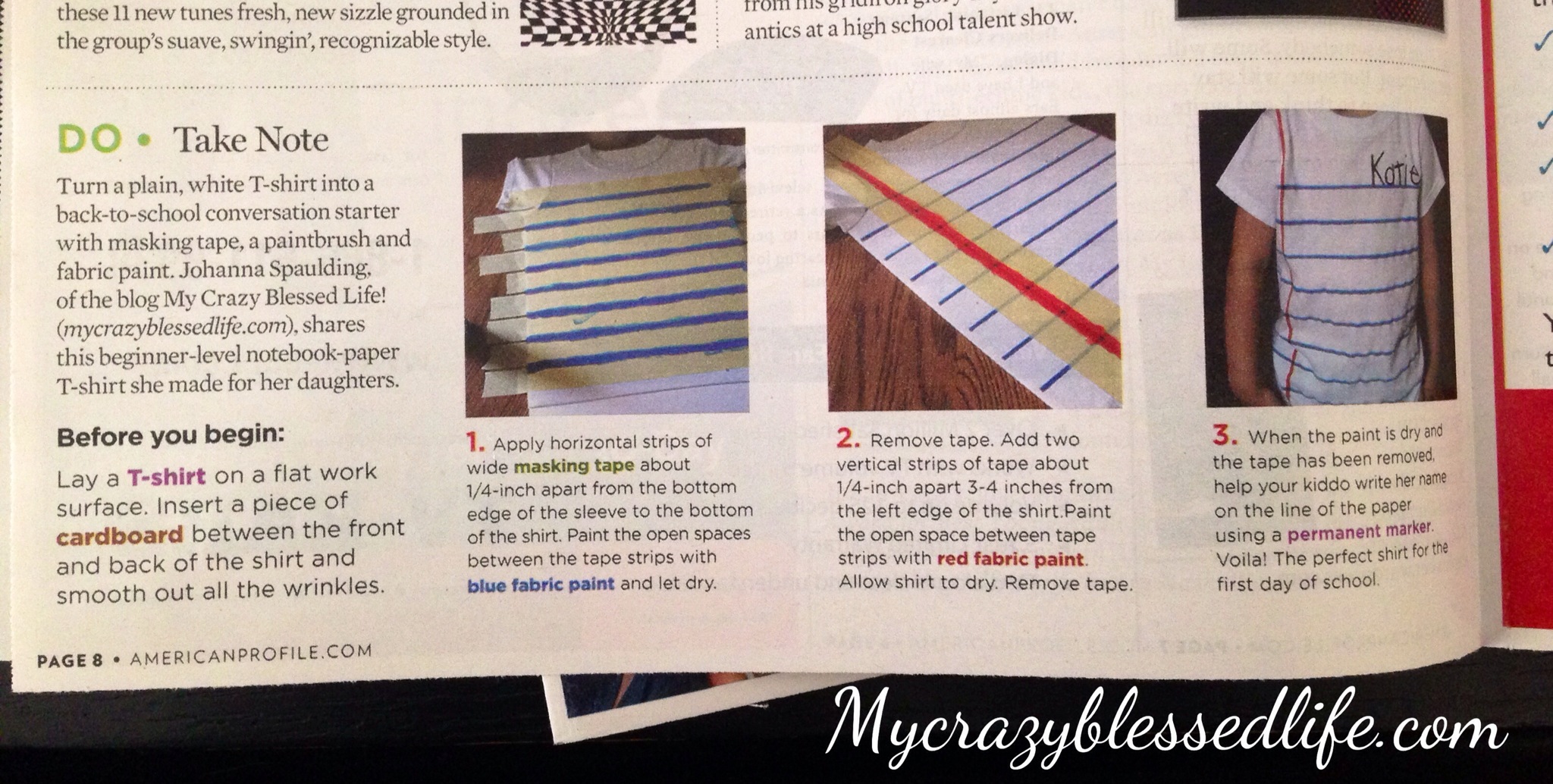 Eek! So I got some really exciting mail today… from American Profile Magazine! I had in my hands 3 copies of the back to school issue that my blog post College Ruled T-shirts was featured in. I wrote this post 3 years ago and it was so much fun to see it resurface and even become a feature in a nationwide magazine! This full color magazine is printed and distributed in newspapers across America. Check them out at AmericanProfile.com.