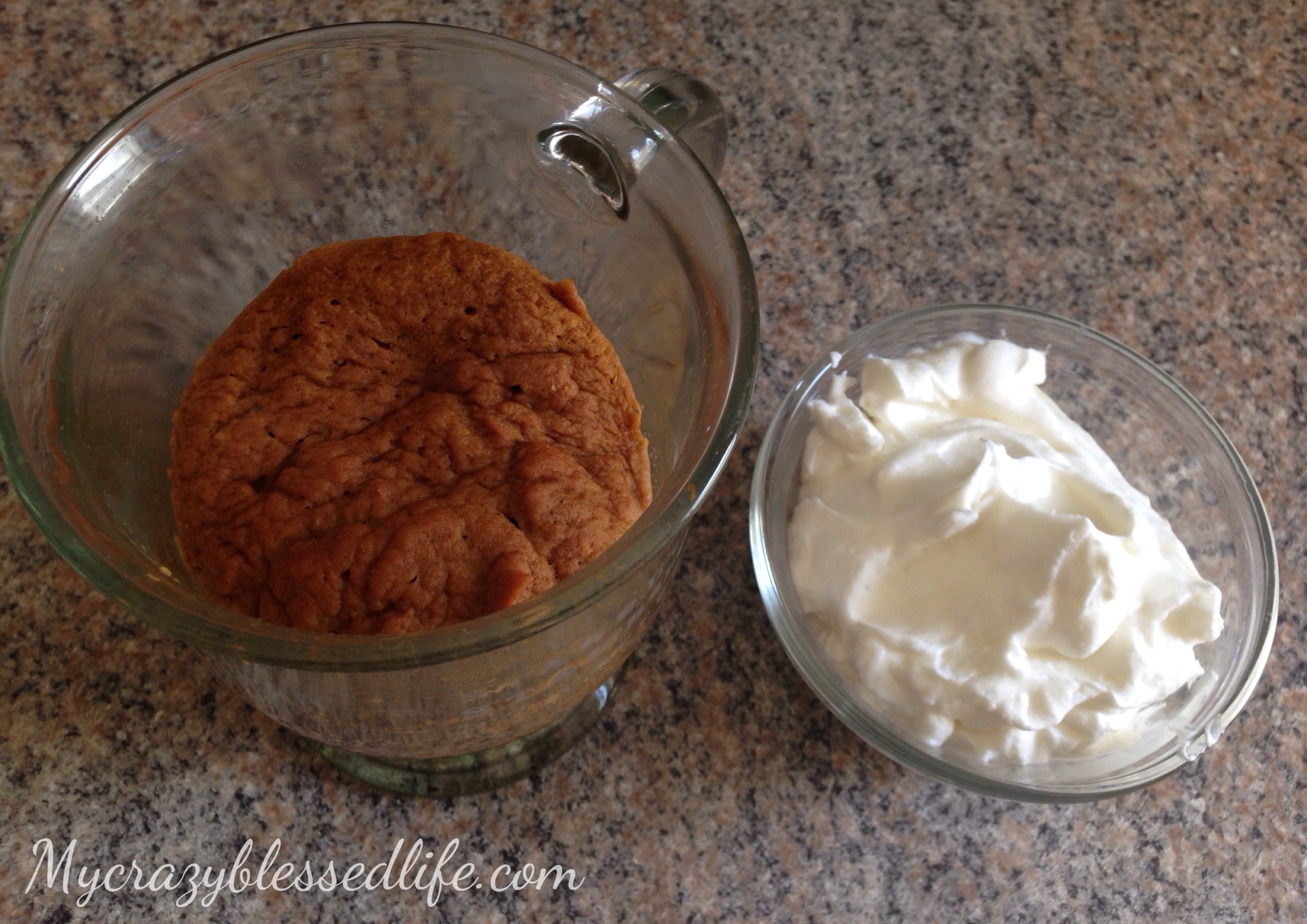 Microwave for 2 1/2 minutes on high. It will come out hot! Let it cool for a few minutes. While it cooled I whipped up some whipped cream to top it off with 🙂