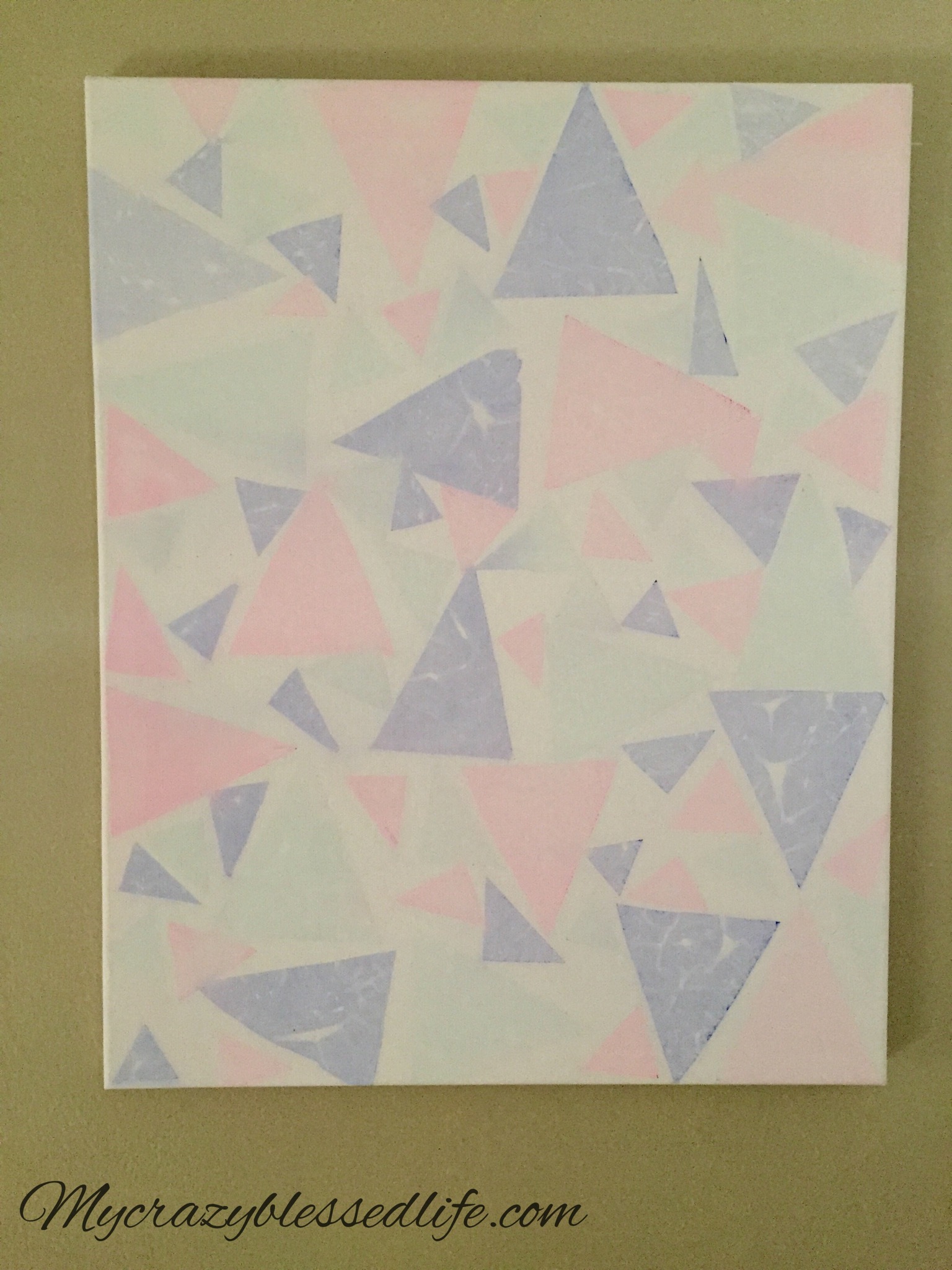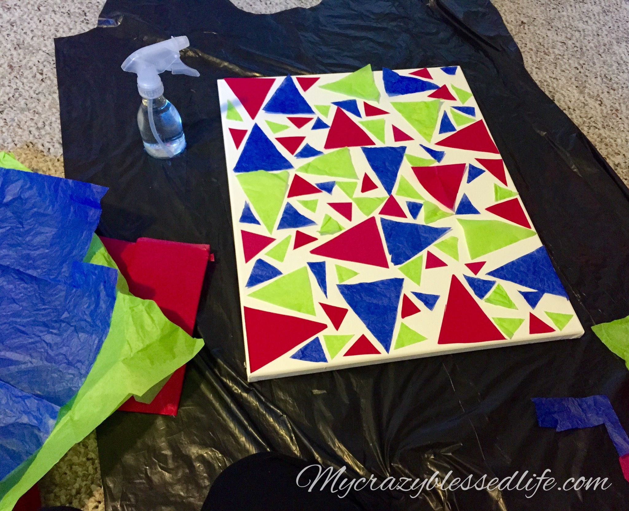 First you need a blank canvas and brightly colored tissue paper. Cut the tissue paper into shapes you like. I wanted triangles for this one. Then place them on the canvas where you want them.