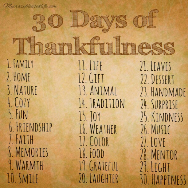 For each day I have one word listed. All you have to do is take a picture of something that word makes you think of to be thankful for. Then if you want to you can tag mycrazyblessedlife.com’s fb page/Twitter account when you post the photo. Or just write it down and keep it as a private challenge. Although I would love to see your photos! I will be participating throughout the month too ๐Ÿ™‚ let’s fill November with Thankfulness!