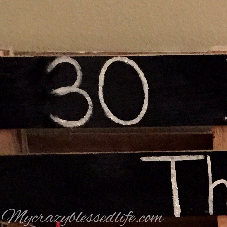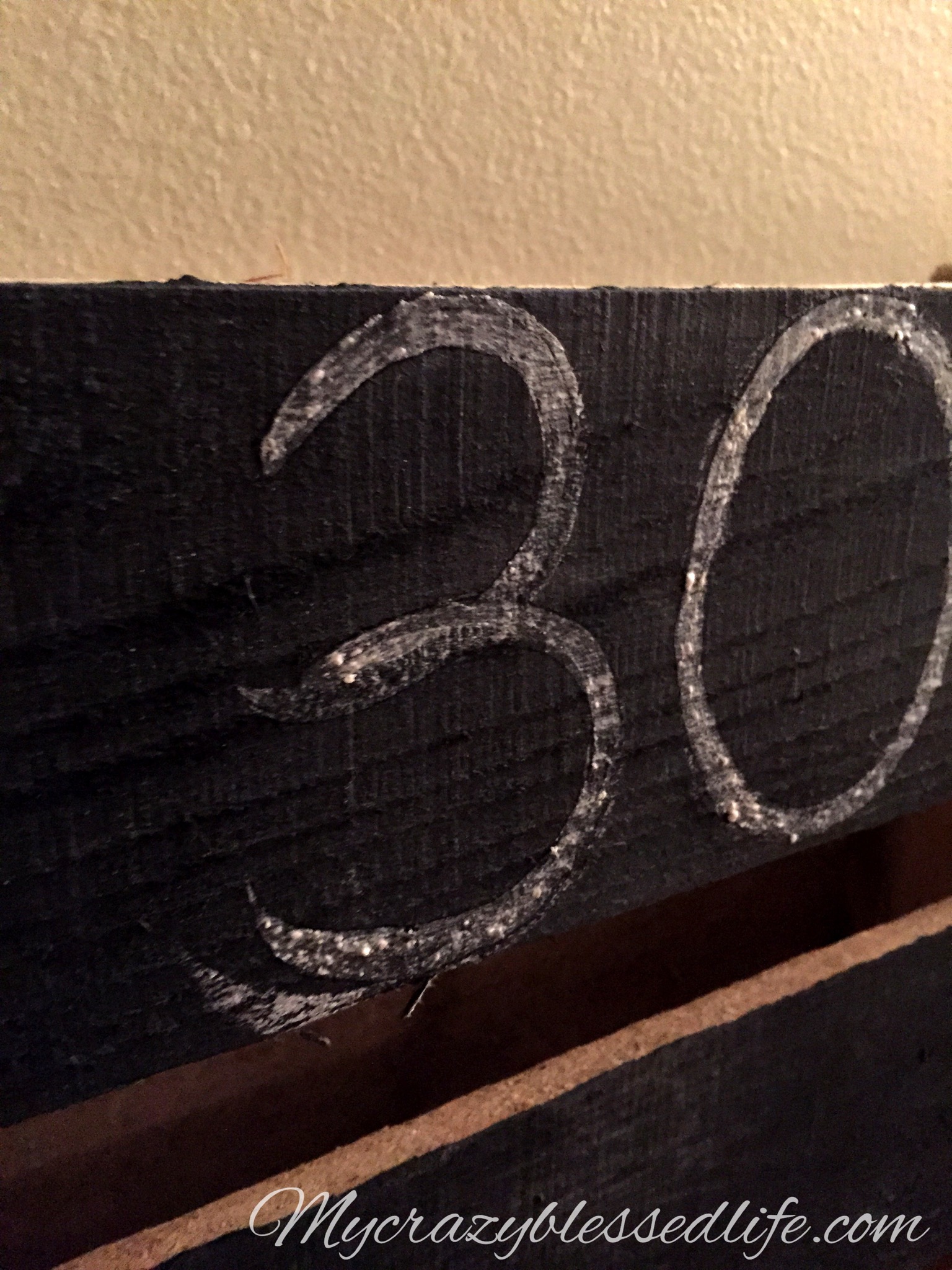 Then I used a thin line brush to paint on the chalk numbers and letters for “30 Days Of Thankfulness” I’m adding two pics of the process because when I first painted it on it seems see through like I would need to go back over it. Nope! When it dries it was bright white with only one time through.