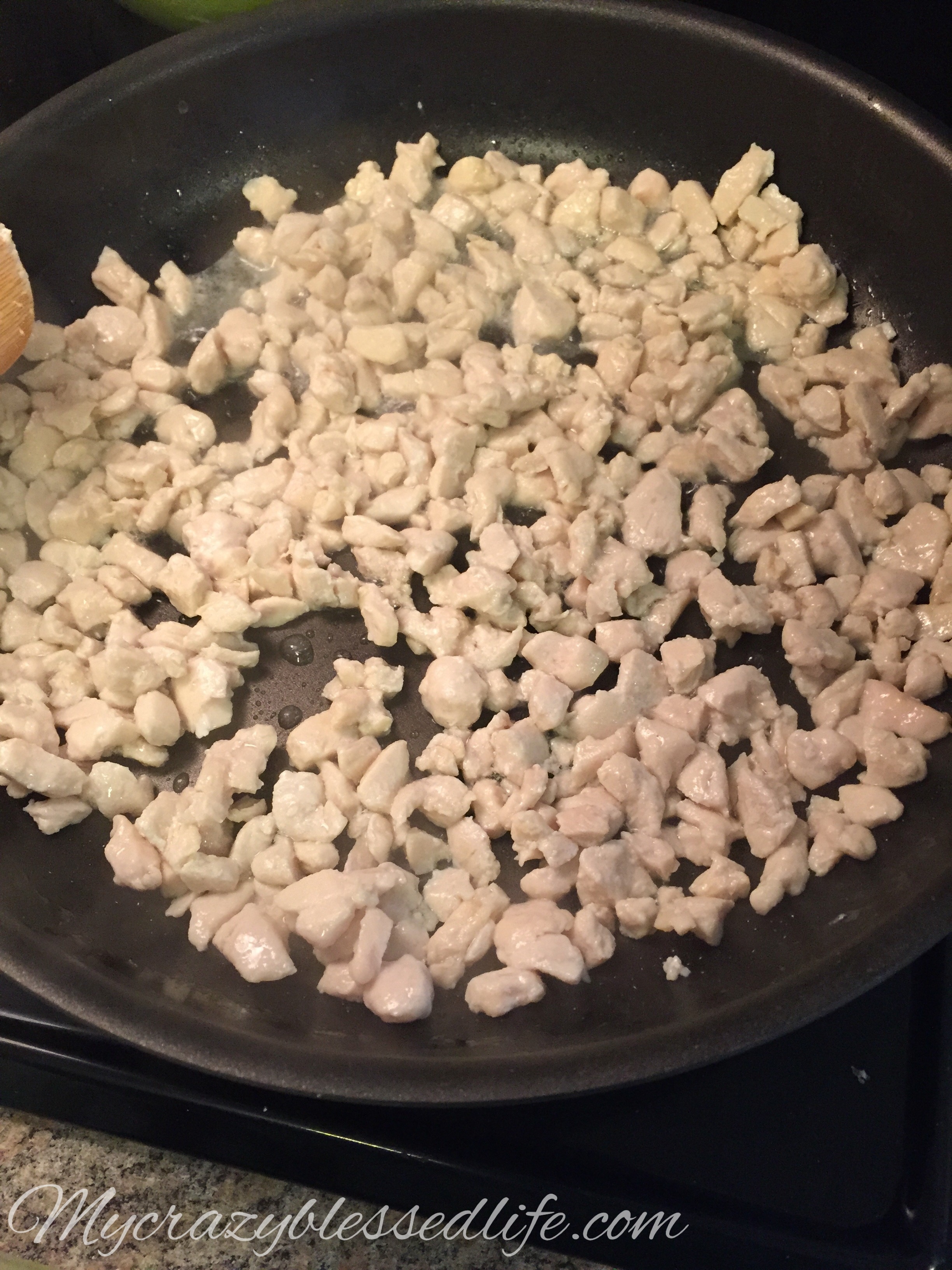 1. Use a large skillet to cook the chicken in a little bit of vegetable oil. Stir until cooked through.