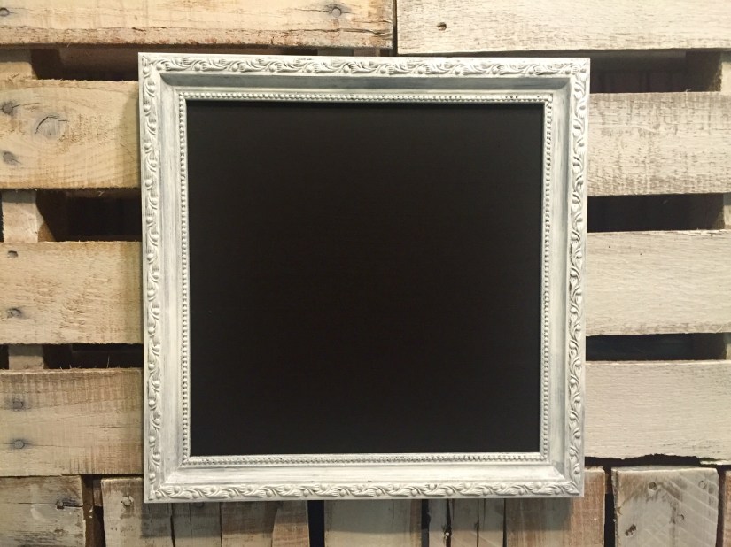 I didn’t want a black frame on the black chalkboard so I went with white washed look by lightly brushing on white acrylic paint. I like a shabby chic look, but you could spray paint or paint until fully covered for a cleaner look. Here is the frame after: