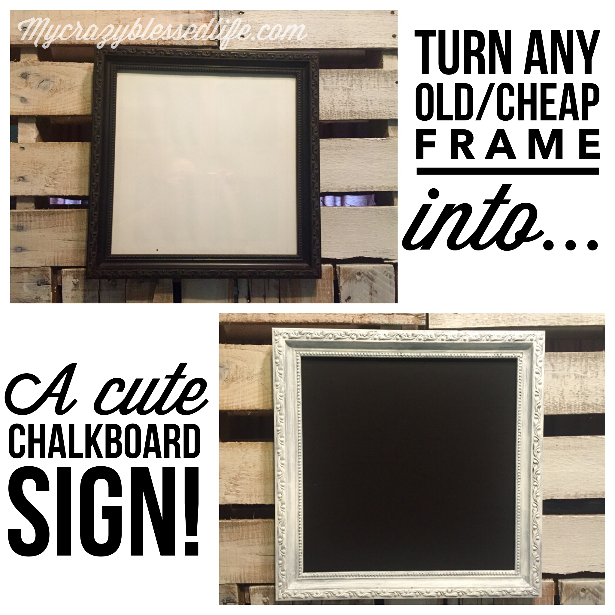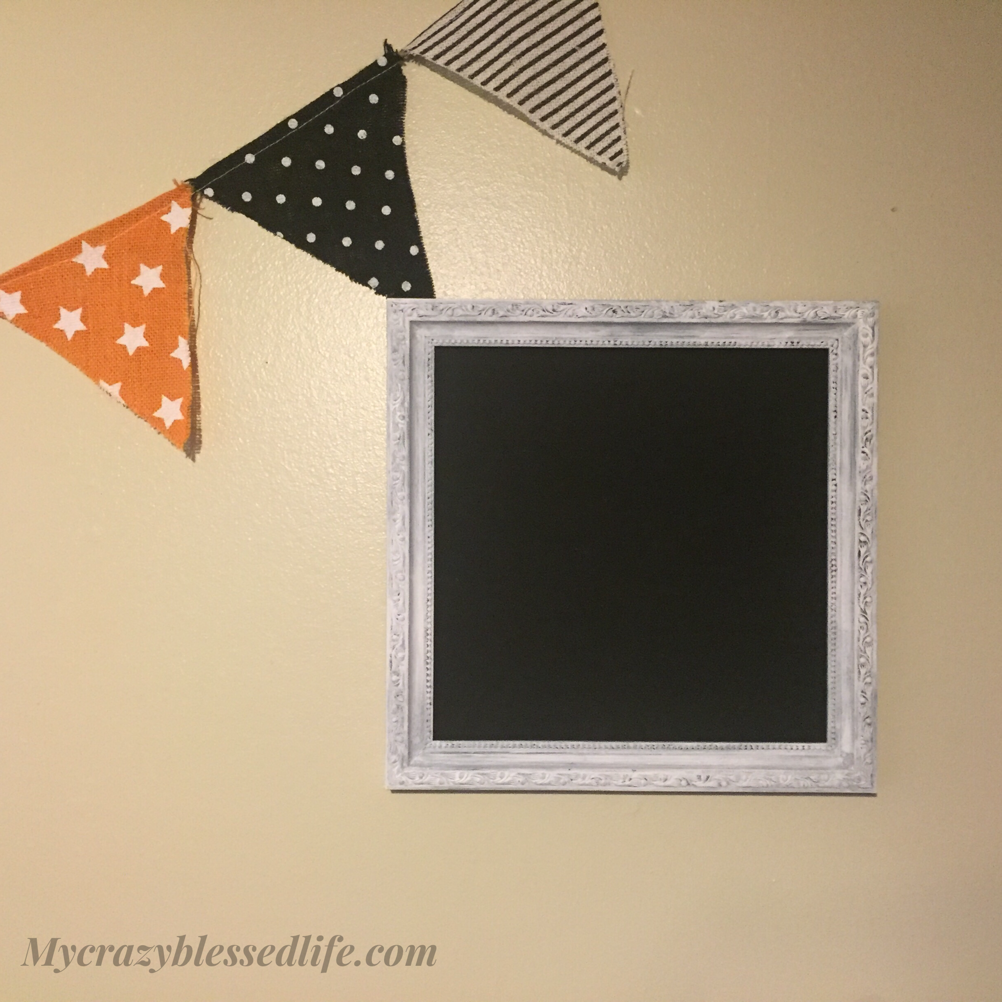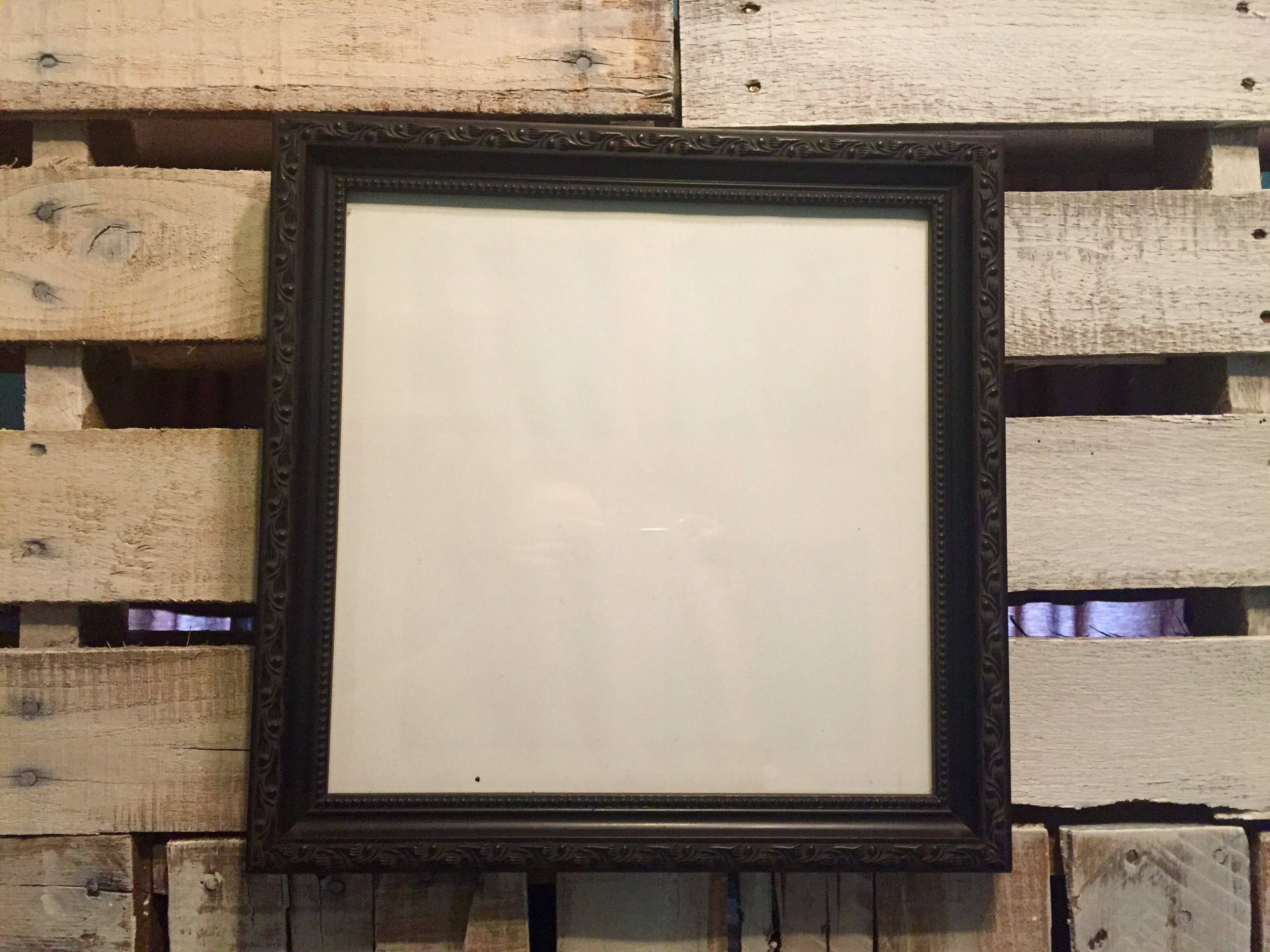 I didn’t want a black frame on the black chalkboard so I went with white washed look by lightly brushing on white acrylic paint. I like a shabby chic look, but you could spray paint or paint until fully covered for a cleaner look. Here is the frame after:
