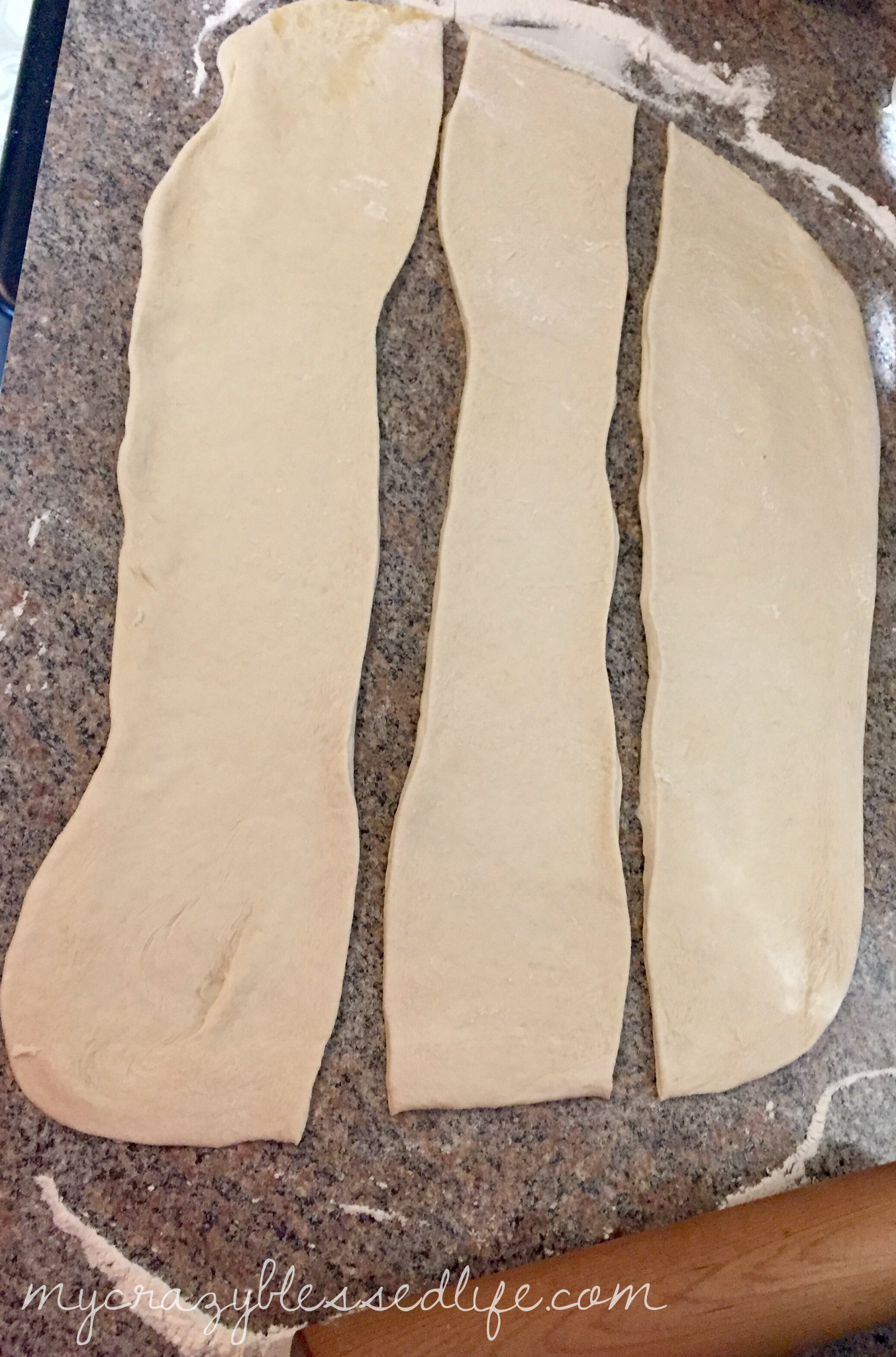 First roll out your pizza dough into a large rectangle. Then cut it into about three strips. They don’t need to be perfect as you can see!