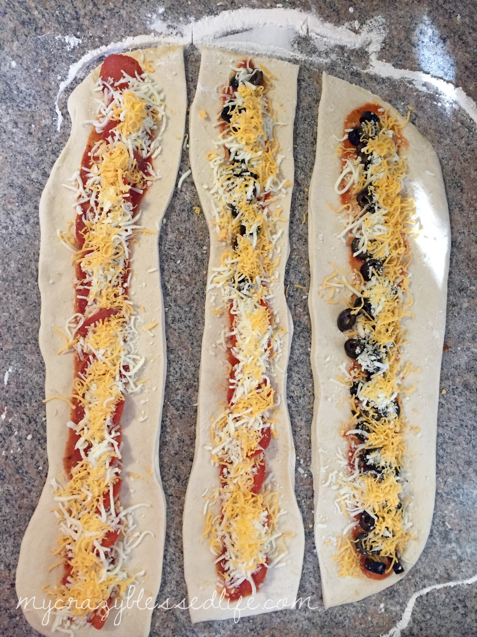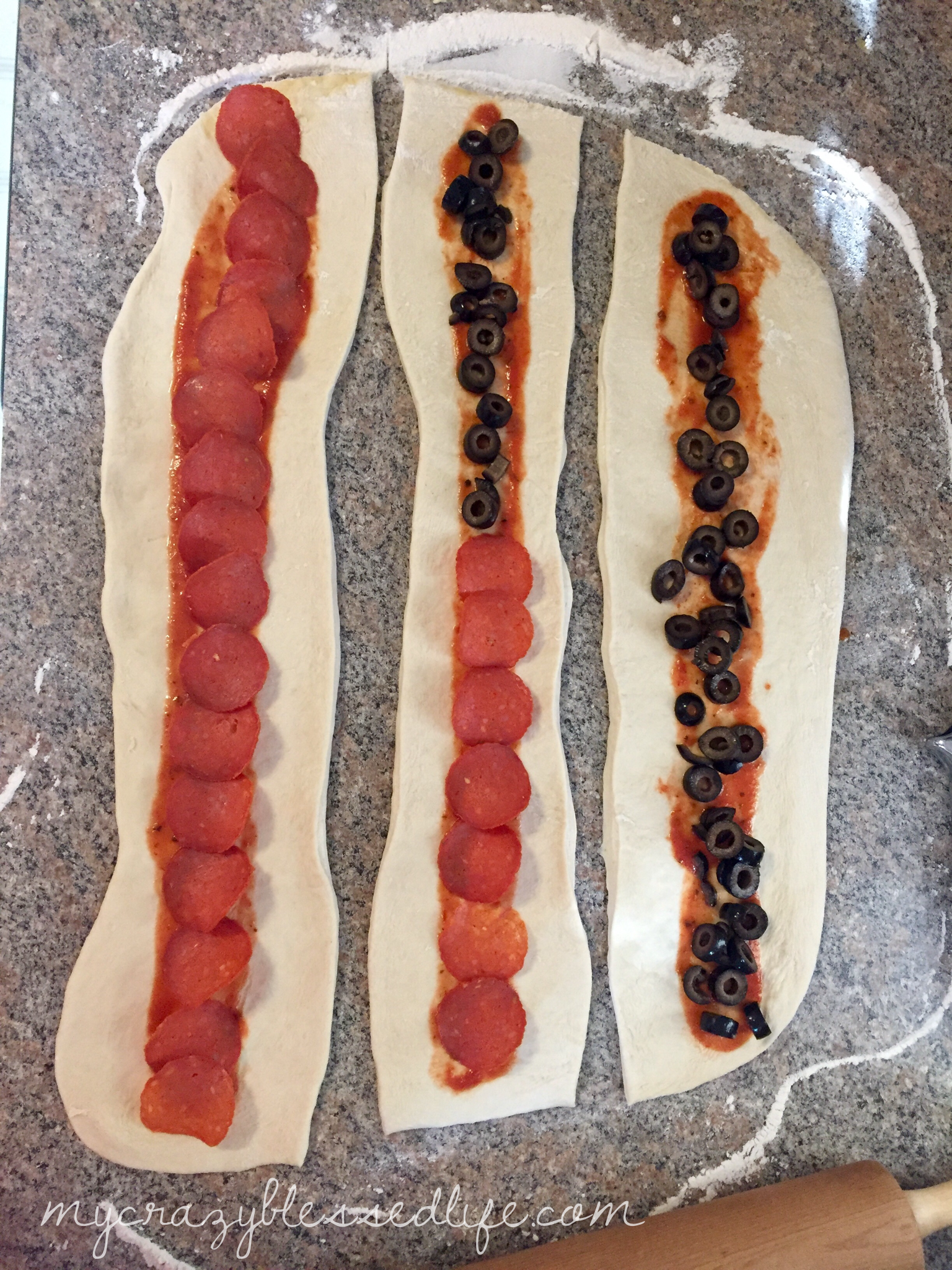 Favorite pizza toppings (I’m using olives and pepperoni for this post)
