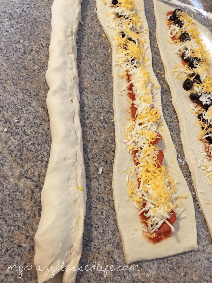 Next put tomato sauce down the middle of each strip of dough. Add your favorite toppings down the middle also.