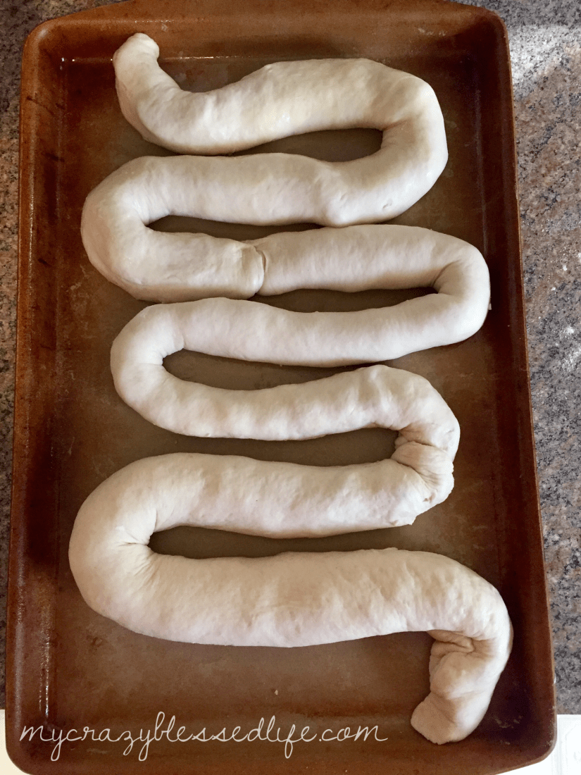 Place seam side down on a greased baking pan. I always use olive oil for pizzas, and I like the way they bake on my stoneware. Shape into an intestines shape as you lay it down.