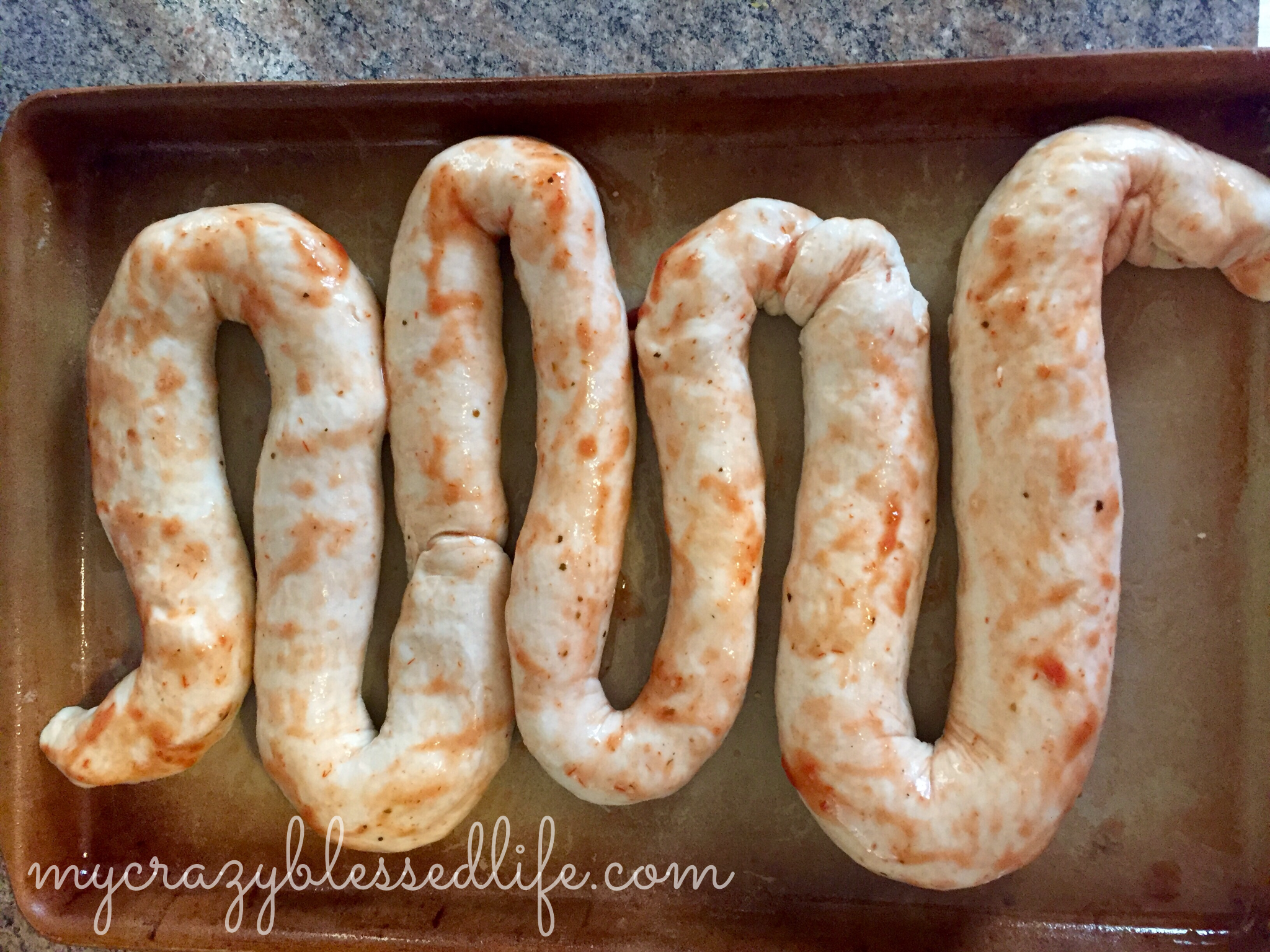 Pizza Dough (if you click on the link to my pizza dough recipe one batch made both the intestines-shaped pizza and 16 breadsticks)