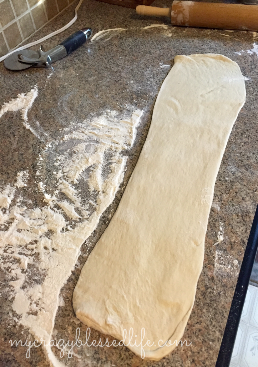 Roll out your pizza dough into a long skinny rectangle.