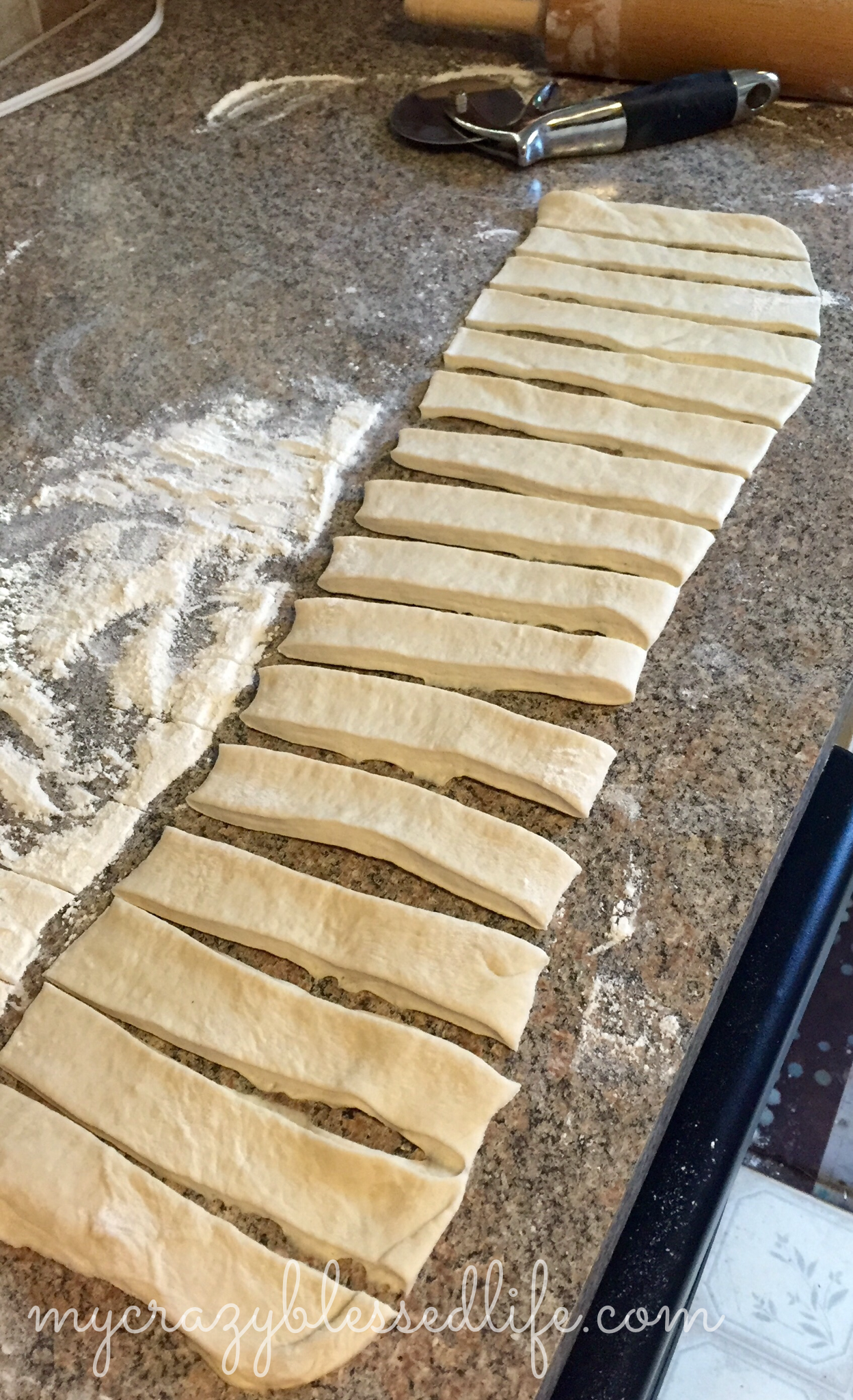 Next use a pizza cutter to slice it into strips about 1 1/2″ wide.