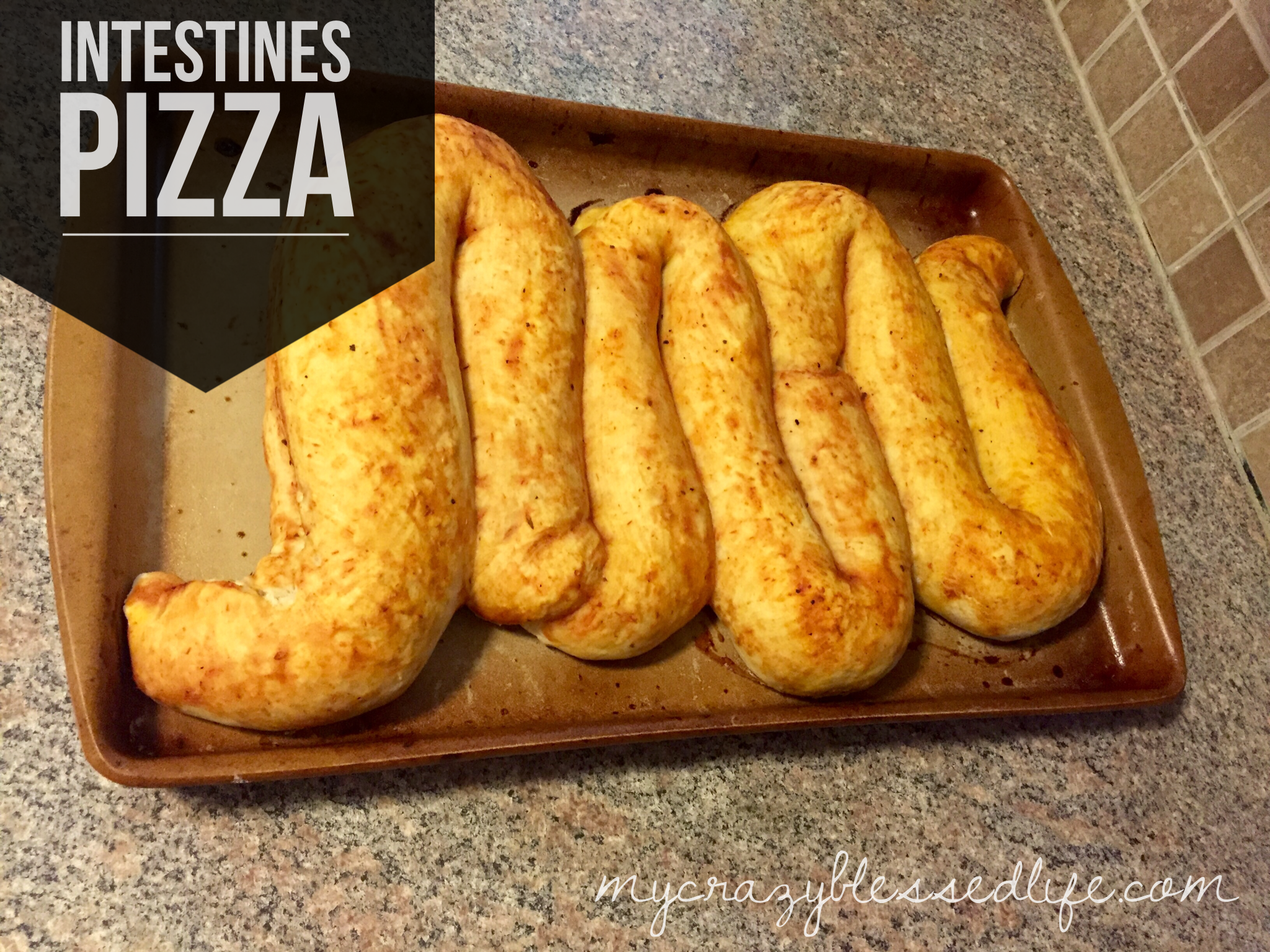 There you have it! Yummy yet gross looking intestines-shaped pizza.