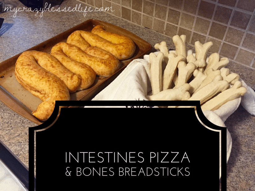 As a fun weeknight meal for my kiddos this week I made intestines-shaped pizza and bone-shaped breadsticks! The kids thought it was so silly and fun they loved it. These would be great served at a Halloween party or just any day for a spooky meal.