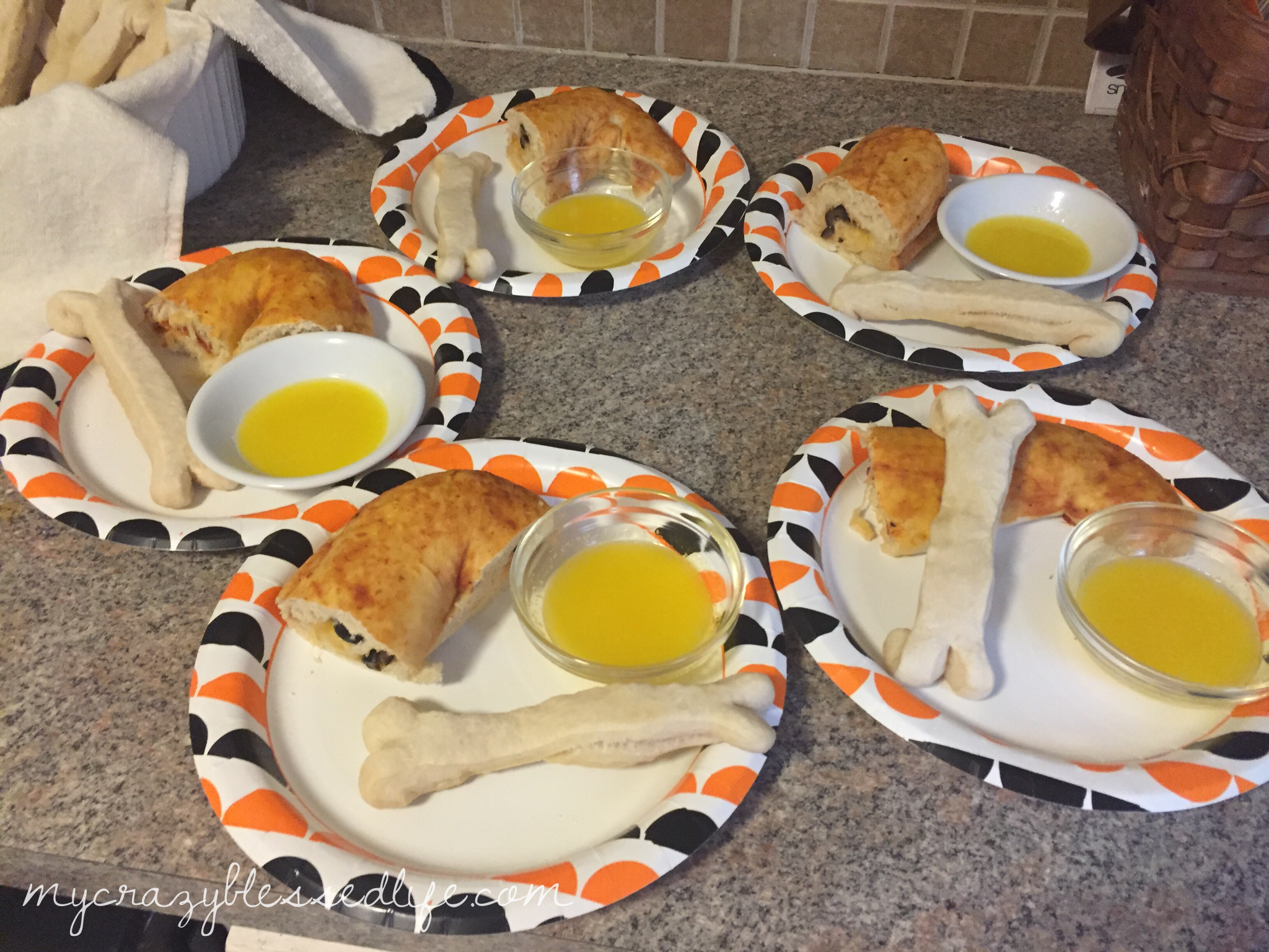 Those are our plates with the sliced up intestines pizza and bone breadsticks. Oh and I melted a little butter and garlic to dip the breadsticks in. Have a fun week and be silly with your family! Thanks for stopping by 🙂